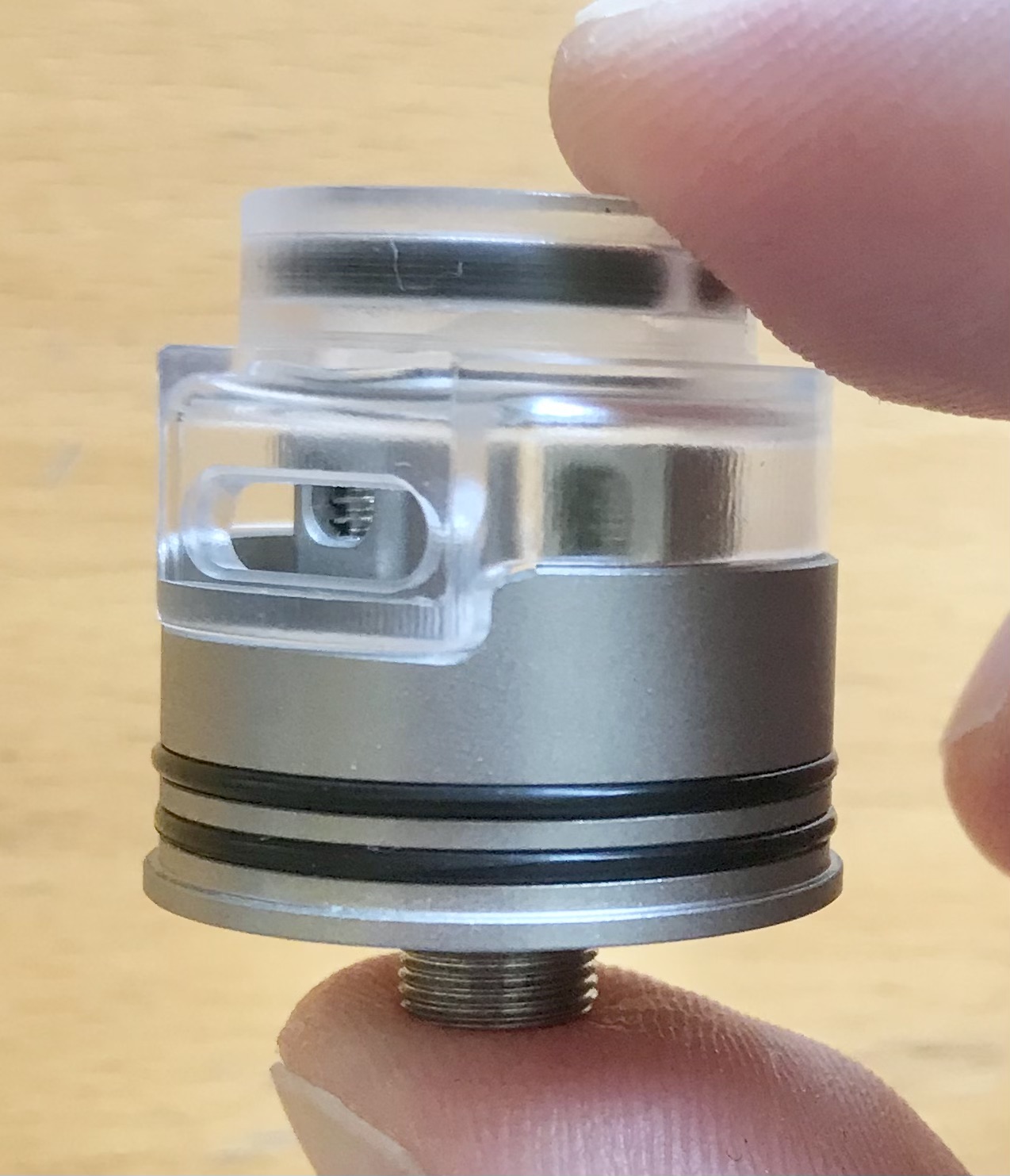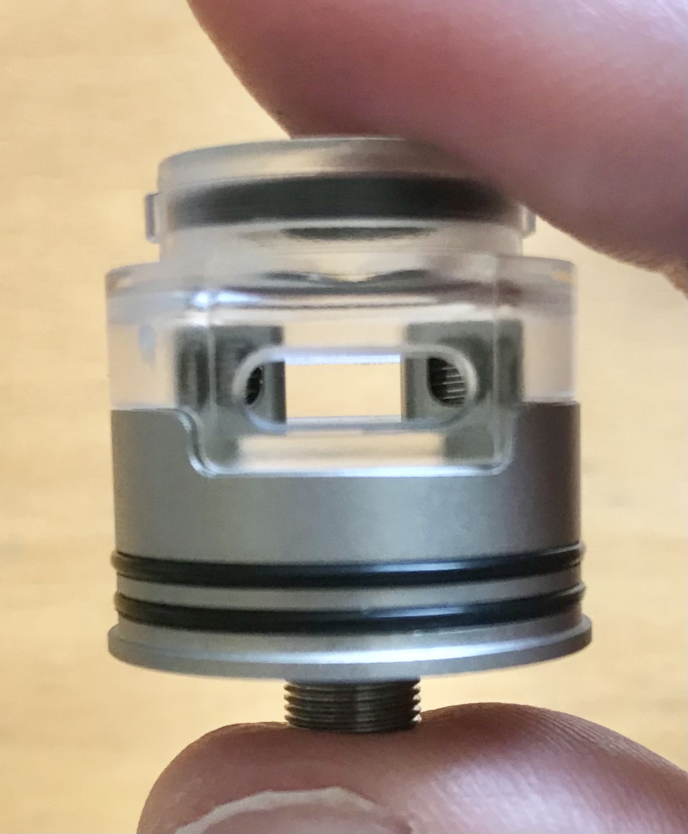 Dadurch dass der außere Lufteinlass auch höher liegt ist ein übertröpfeln nahezu ausgeschlossen. Dann würden die Coils schon komplett im Liquid schwimmen.