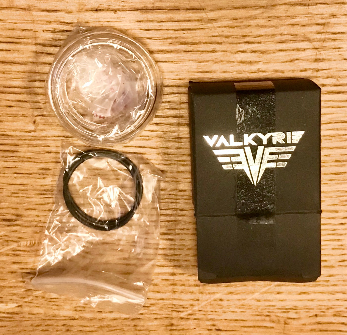 In der braunen Schachtel ist der Verdampfer, eine Bodenplatte mit 28 mm Profil, Anleitung, Ersatz O-Ringe und zwei Ersatzschräubchen für das Deck.