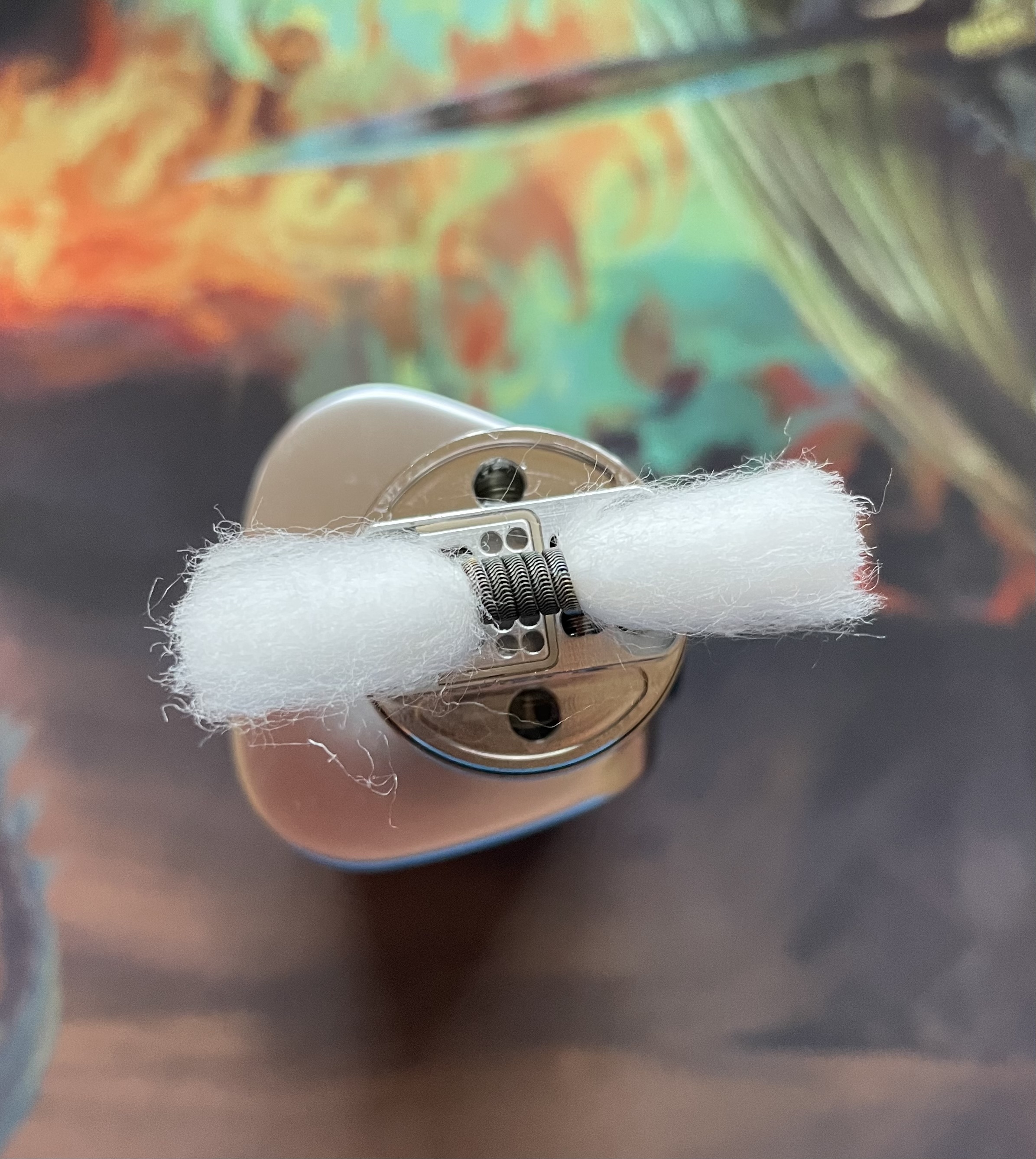 Die Coil mit dem beigelegten Cutting Tool kürzen, in die Aufnahmen fallen lassen, festziehen (yeah Schlitzschrauben 👍), ausglühen, Watte durchziehen, wie auf dem Foto einkürzen, Liquid rein und los gehts 😊