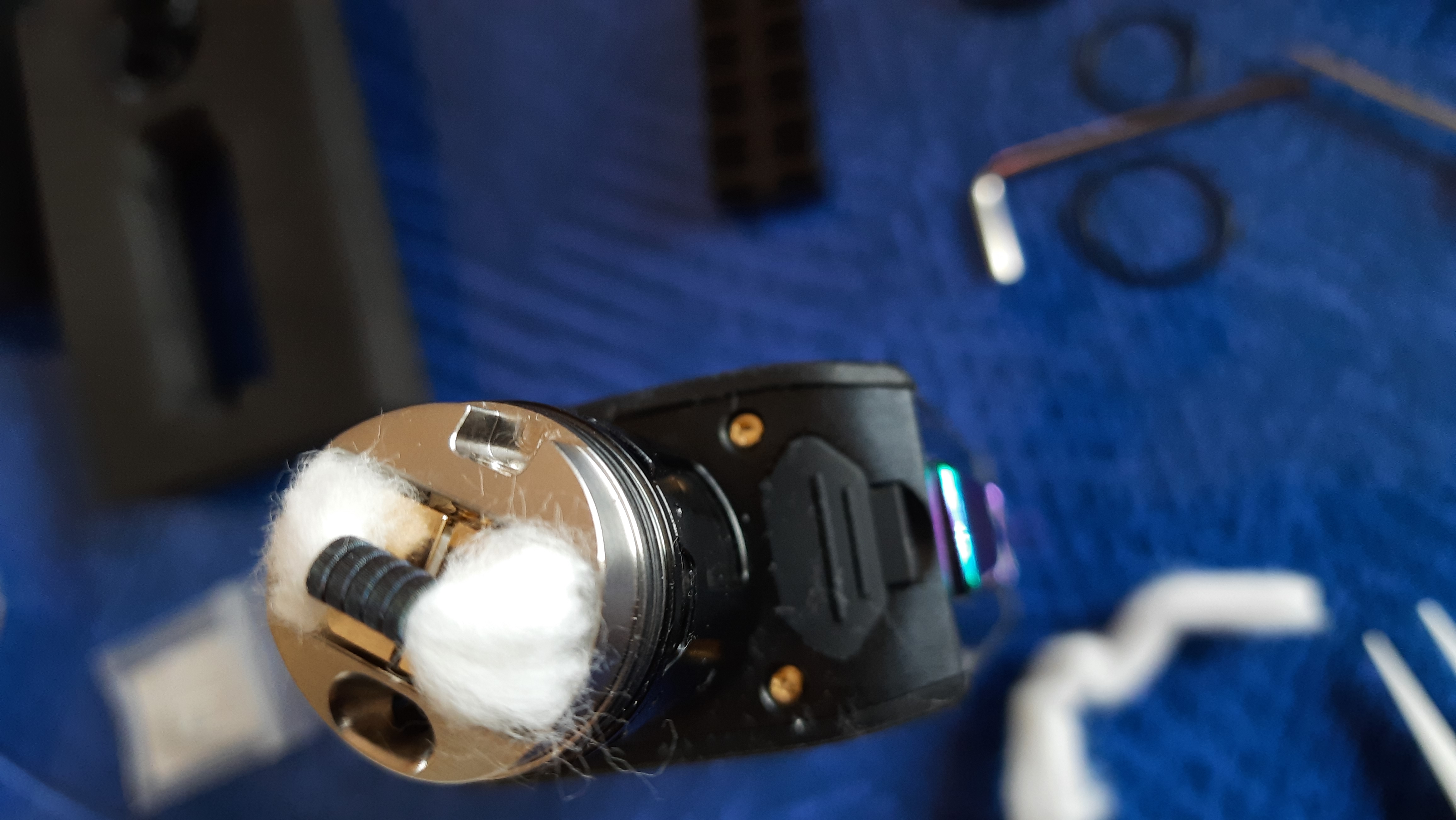 Dann hab ich in Intervallen ein Paar Tröpfchen Liquid auf die Watte gegeben und parallel den Tank gefüllt.