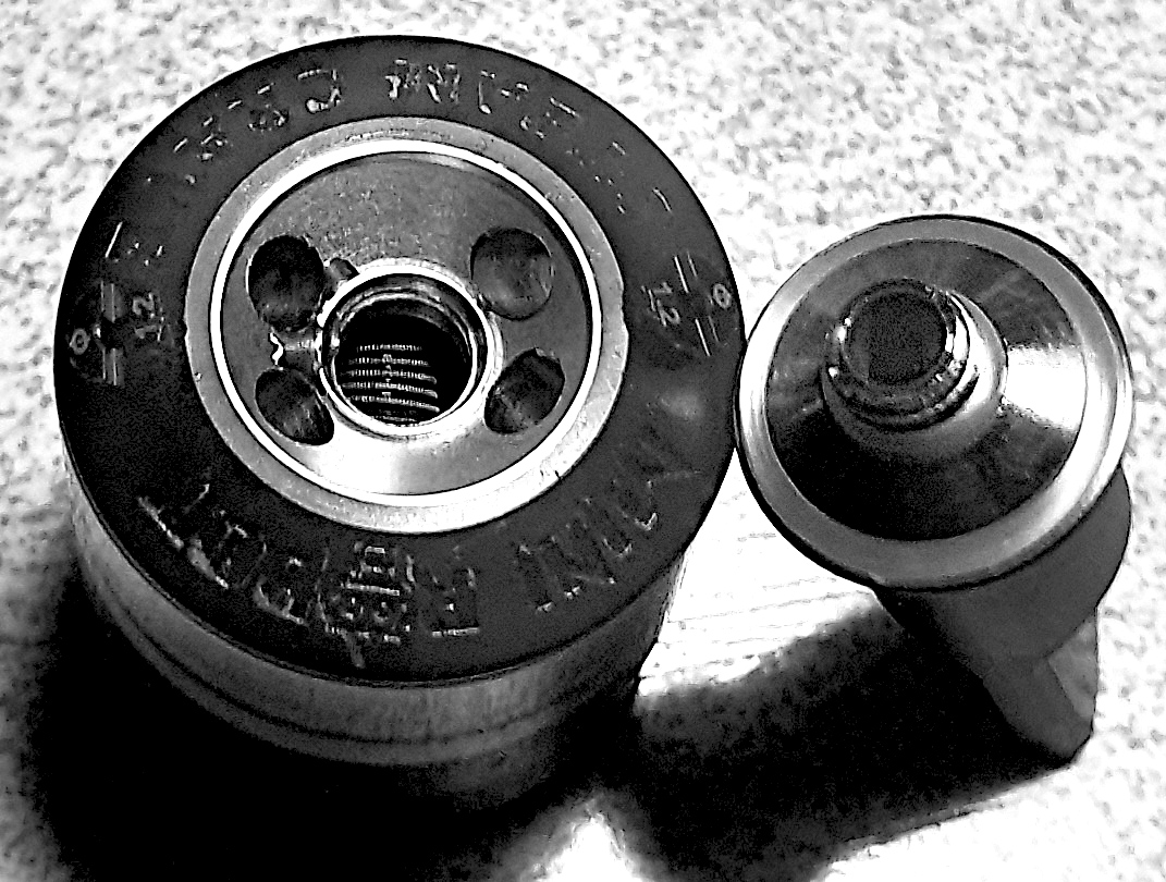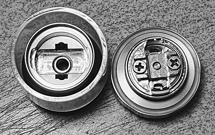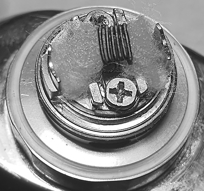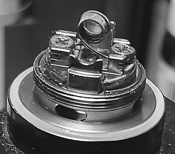 Hier der einfache Deckaufbau mit der kleinen, rechteckigen Dampferkammer, in der seitlich die Luftdüsen ragen, die Wicklung gut umströmen und sehr nach am DripTip dann die Wicklung brutzelt. Da der Weg des Dampfes hier recht kurz ist, bevorzuge ich Liquid, das an meiner Coil lediglich 7 Watt braucht, um den gewünschten Geschmack zu entwickeln und dann nicht zu warm an meinen Mund gelangt: