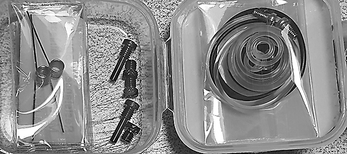 Mit verschieden großen Öffnungen können hier die hohlen Air-Pins einfach rein- und rausgeschraubt werden. Da die Pins gerändelt und auch noch zusätzlich mit einem Schlitz versehen sind, kann man entweder mit spitzen Fingern, oder mit einem Schlitzschraubenzieher arbeiten und - je nach seinen Vorlieben - beliebig starke Luftströmungen erzeugen, ohne dass man gleich die ganze Wicklung abnehmen muss, wie bei so einigen anderen VD! (Im Lieferumfang sind folgende Air-Pin-Röhrchen dabei: 2 x 1.6 mm, 2 x 1.2 mm und 2 x 0.8 mm und letztendlich auch ein 1 Blind-Pin, durch den auch eine Seite der Airflow ganz verschlossen werden kann.)