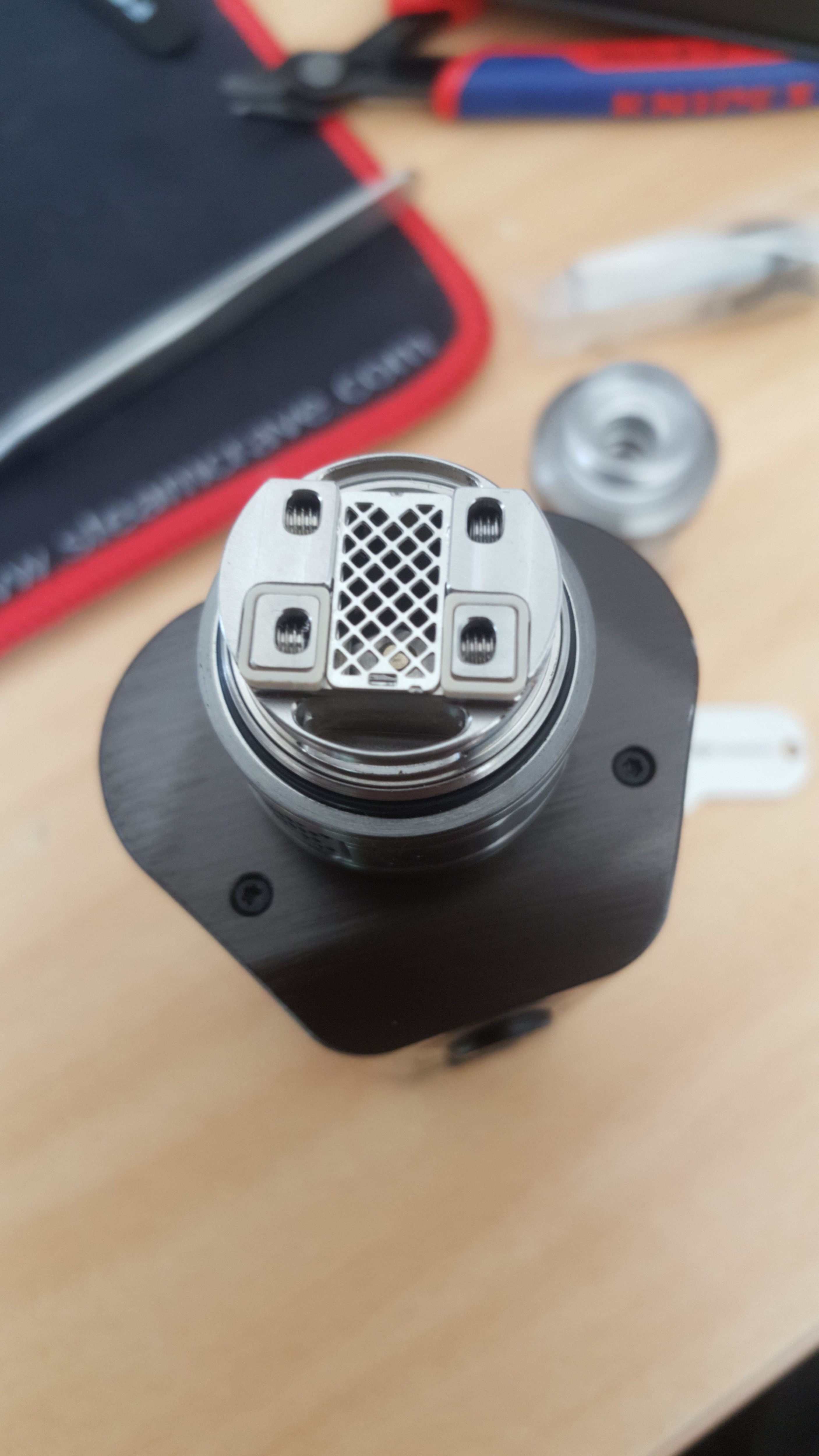 Wie beim Fatality28 ist da erstmal einfach nur ein großes Airflowloch, das von den 4 Löchern für die Coils umrahmt wird. Einem sehr offenen Zug steht also nichts im Wege.