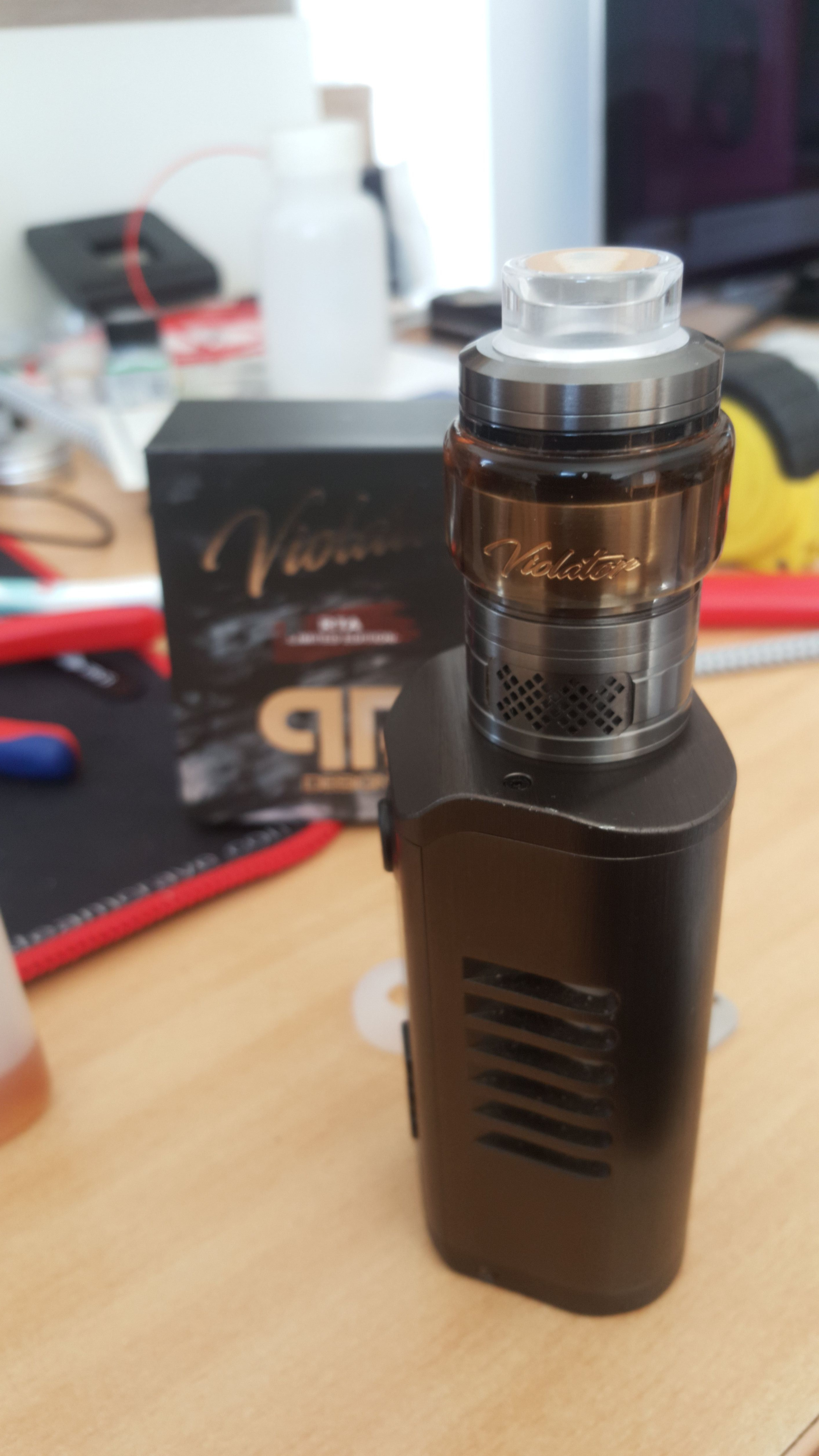 Und schnell mal den Tank drauf geschraubt, die Spannung steigt und ich kanns kaum erwarten, den ersten Zug zu tun. Schnell noch den Tank gefüllt und nu kanns losgehen. Auf der Odin DNA findet der Violator wunderbar Platz, allerdings ist das gunmetal des Odin eh ein dunkleres, der Violator hat eher das SteamCrave-gunmetal.