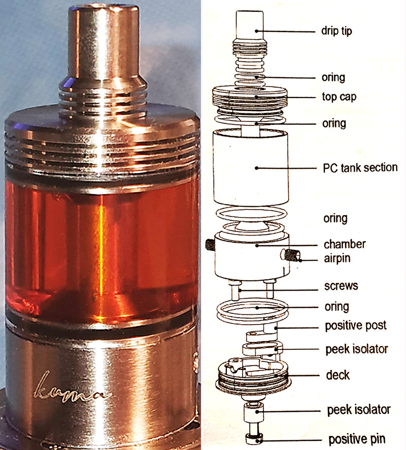 • Der Kuma RTA ist ein echter MTL Selbstwickel-Verdampfer (mit einer eher gemäßigt-strengen MTL-Zugtechnik) aus der italienischen Modderschmiede Ennequadro Mods. Er hat einem Durchmesser von 22 mm und ein Füllvolumen von 4,5 ml.