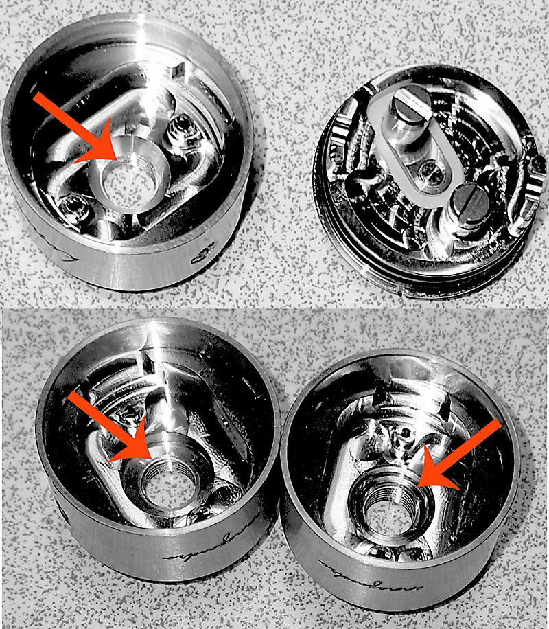 Interessant sind die beiden mitgelieferten Dampferkammer-Glocken, die jeweils unterschiedlich gefräst sind:"45°", konisch-glatt und mit "Stufen" versehen, welche einfach und schnell einfach ausgetauscht werden können. Welche Glocke nun zu welchem Liquid oder seiner Watte-Wickelart passt und auf die Basis (rechts oben) geschraubt wird, muss jeder selbst ausprobieren: