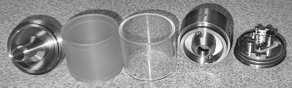 Der Tank des Kuma RTA, der wie beim FeV nach dem Abschrauben des Tanks von unten (sehr bequem dank riesiger Öffnung) gefüllt werden kann, besteht aus PC oder man nimmt einen optional bestellbaren Glastank, den ich auch gleich mitbestellt und eingebaut habe.
