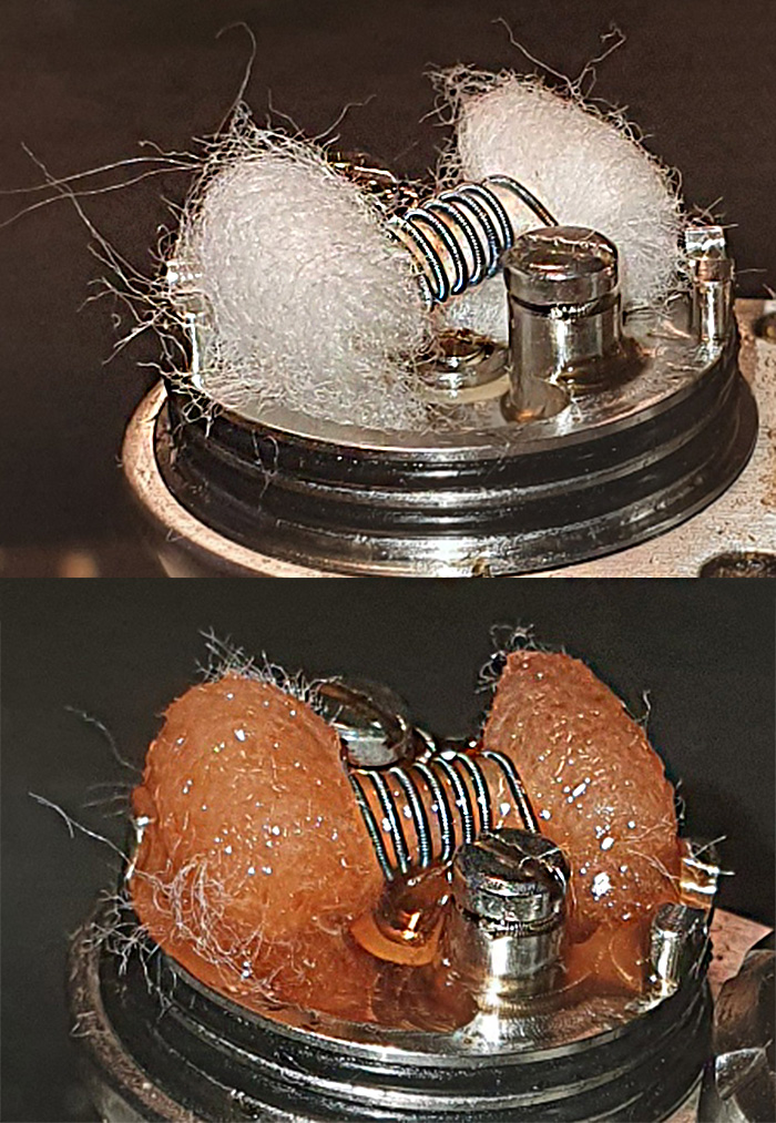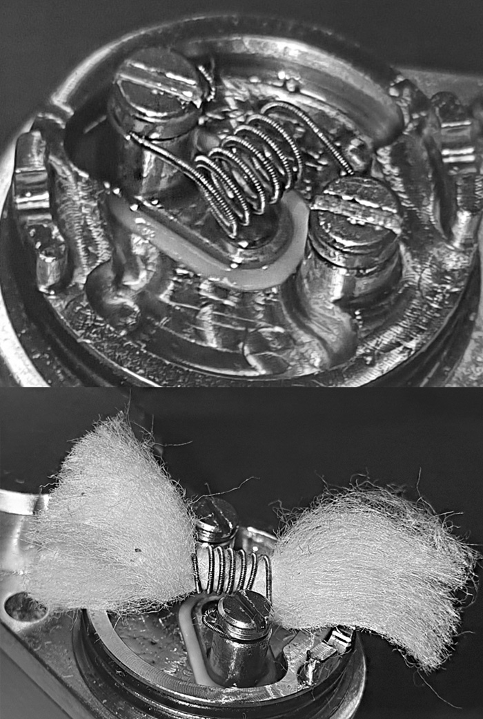 Das Liquid läuft wie beim FeV über zwei eingebaute Dochte, die direkt auf die Watteenden an der Wicklung treffen, wenn die Watte auch wirklich hoch genug eingesetzt worden ist! Hier muss man schon (wie halt auch beim FeV) aufpassen, dass ein genügender Kontakt besteht, sonst flutet man sehr leicht seine Dampferkammer und alles kommt aus den Luftlöchern herausgekrochen!.