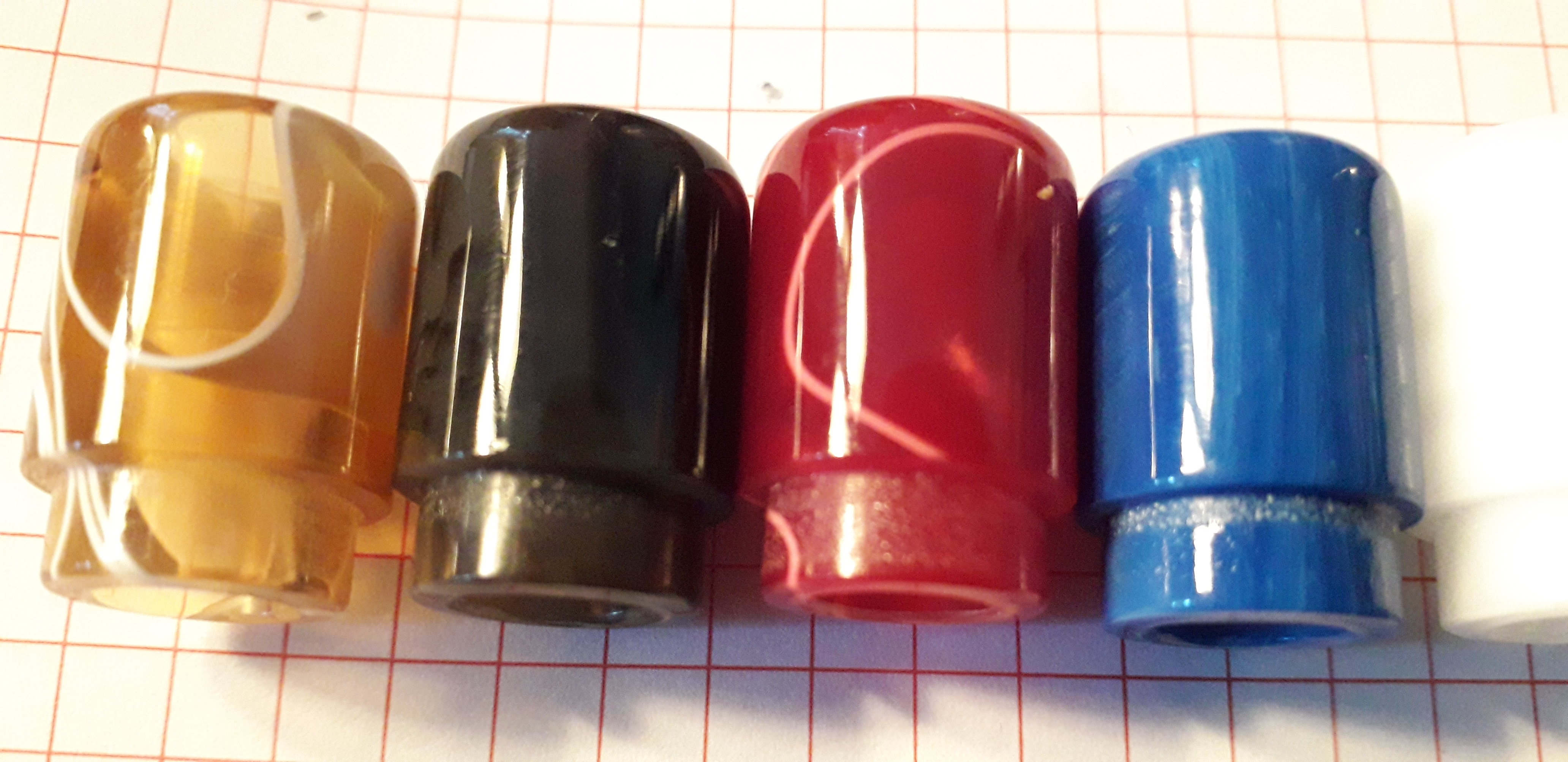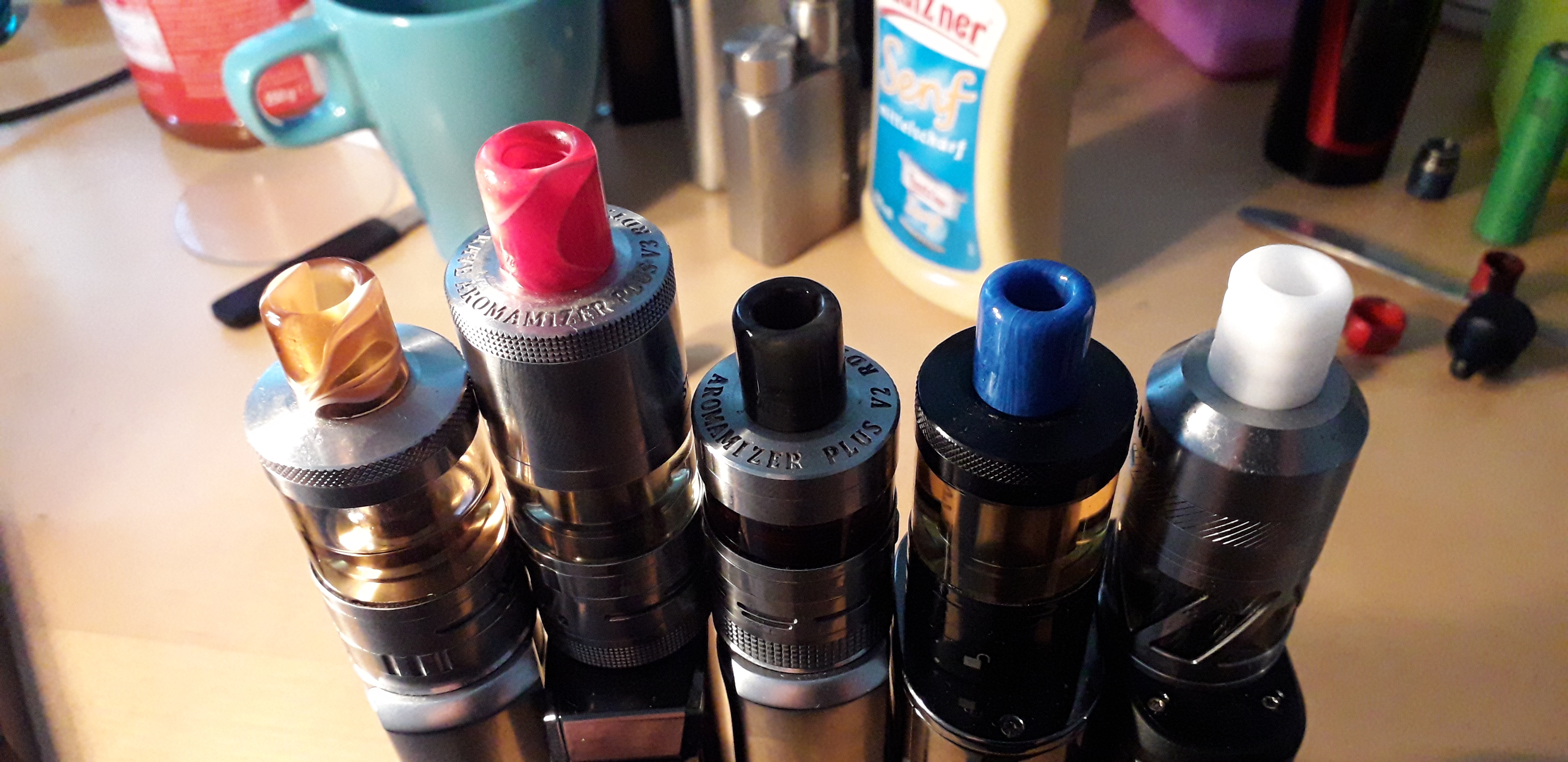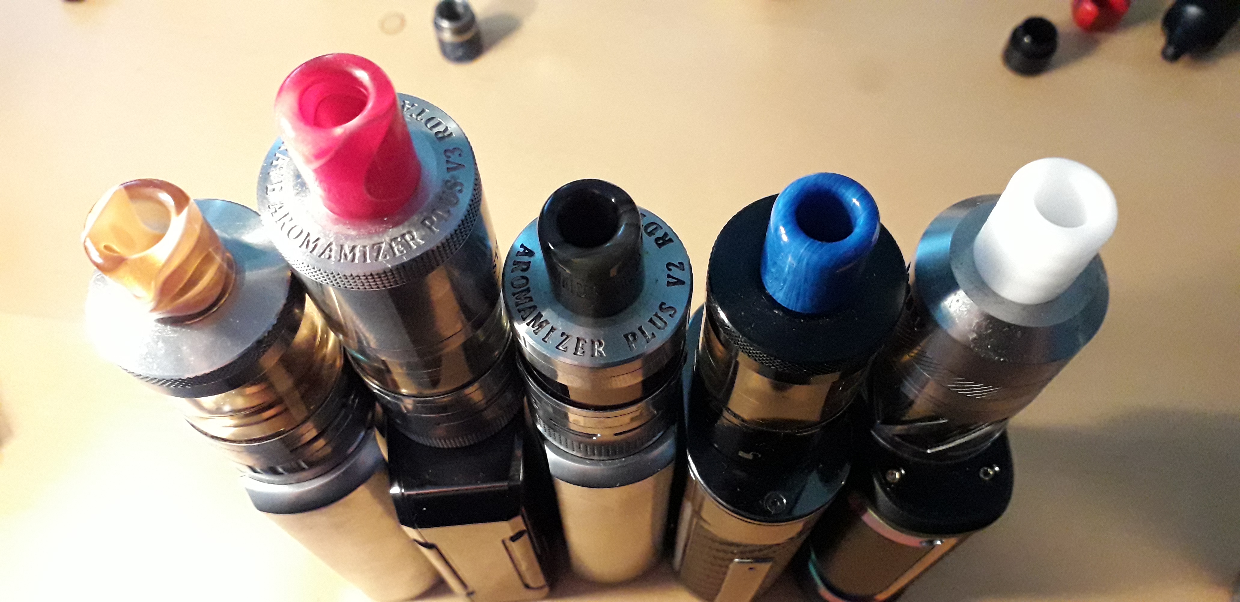 Meine liebsten Drip Tips. Einmal das Jigsaw (rechts). Das ist mein absoluter Favorit. Super Mundgefühl. Hat nur den Nachteil das es ziemlich lose im Verdampfer sitzt. Also nix für unterwegs. Und das andere die habe ich vor ein paar Jahren in China bestellt. Die sind auch ziemlich gut.