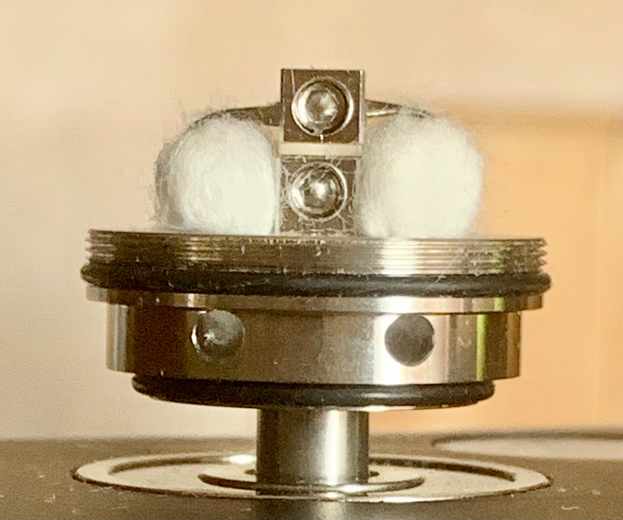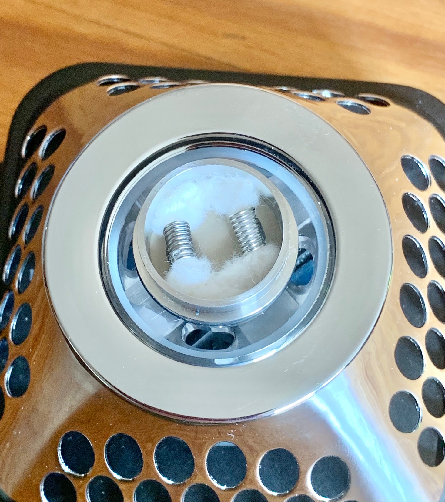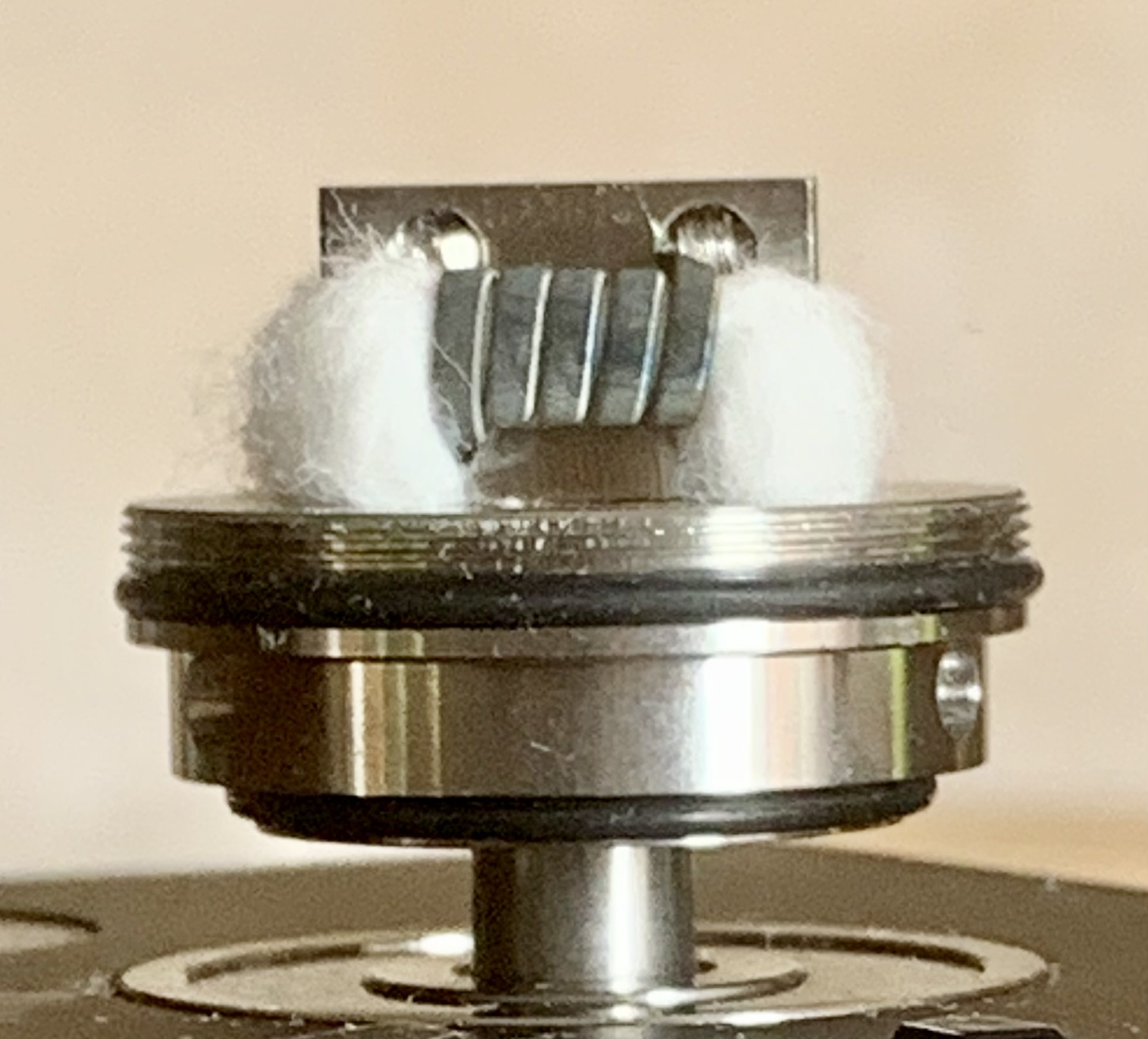 Ich bin zugegeben skeptisch, wie das mit ordentlich Leistung funktionieren soll/kann. Aber das Ding sitzt ja auch verkehrt herum in der Dampfe und die Watte muss das Liquid nicht nach oben ziehen. Dazu kommt der Druck von bis zu 30 ml Liquid. Ich werde sehen.