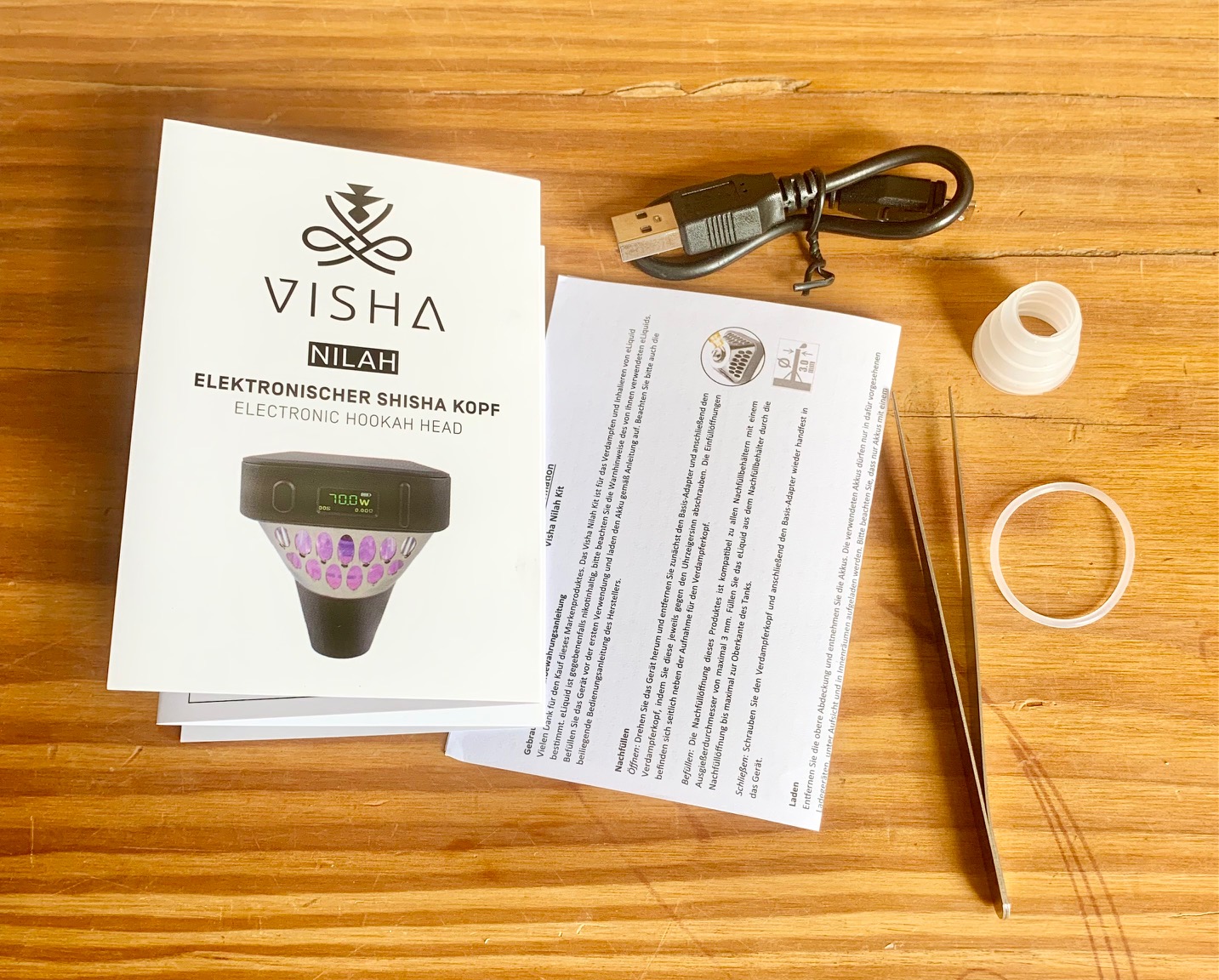 Enthalten sind der Kopf, Silikondichtung für die Rauchsäule, Pinzette(??!?), Ersatz-O-Ring, und Anleitung.