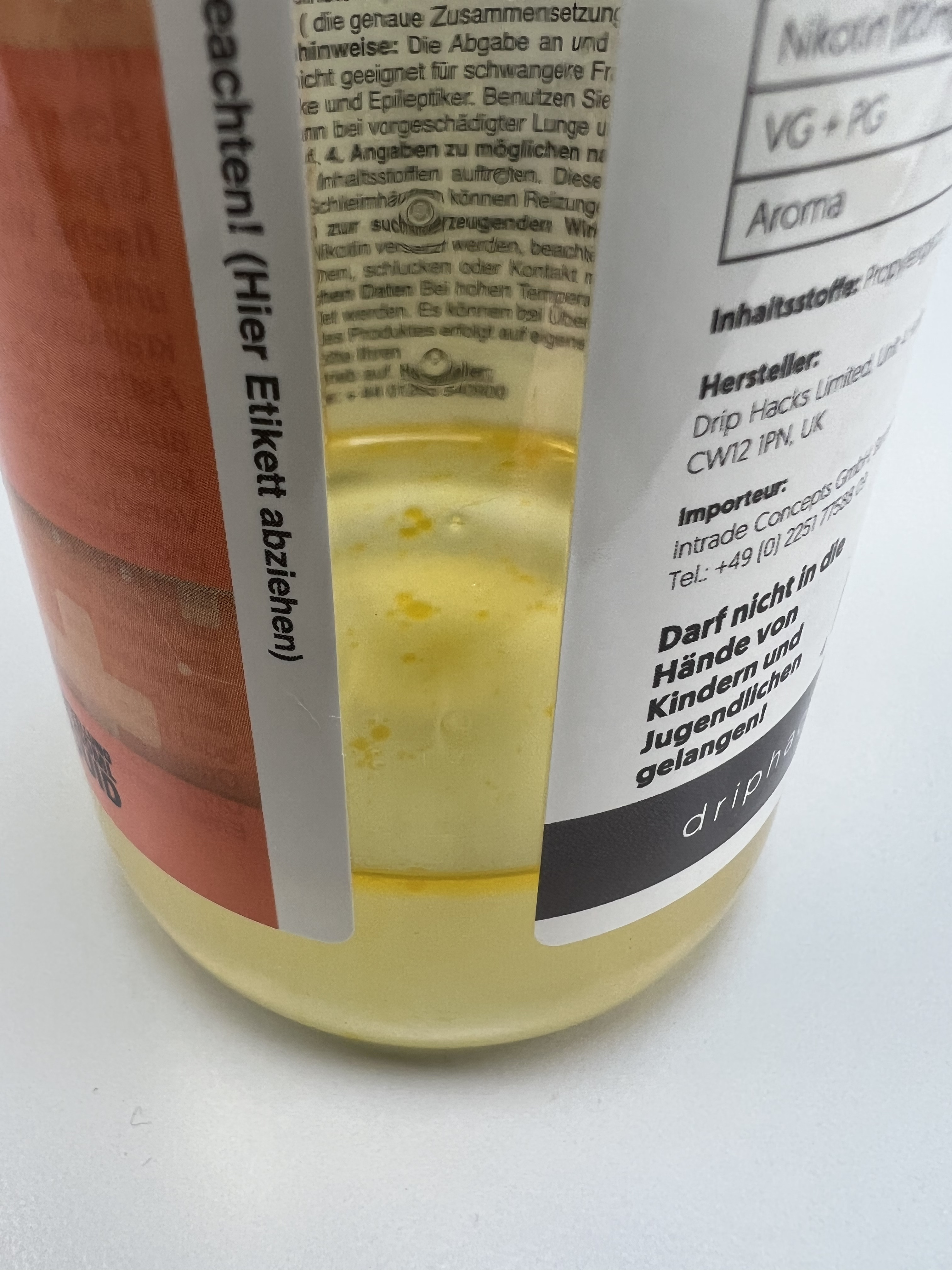 Ich hab das Zeug auch mal gehabt vor einiger Zeit, bei mir war das ziemlich intensiv orange gefärbt (der Hersteller hat zumindest damals gerne mit Farbstoffen gespielt), mit leichten Schlieren im Aroma. Angemischt wurde das zu einer milchig trüben, orangefarbenen "Suppe" die erst nach mehr als einer Woche ganz langsam klar wurde. Hat mich nicht vom Hocker gehauen, aber geschmeckt hats schon.