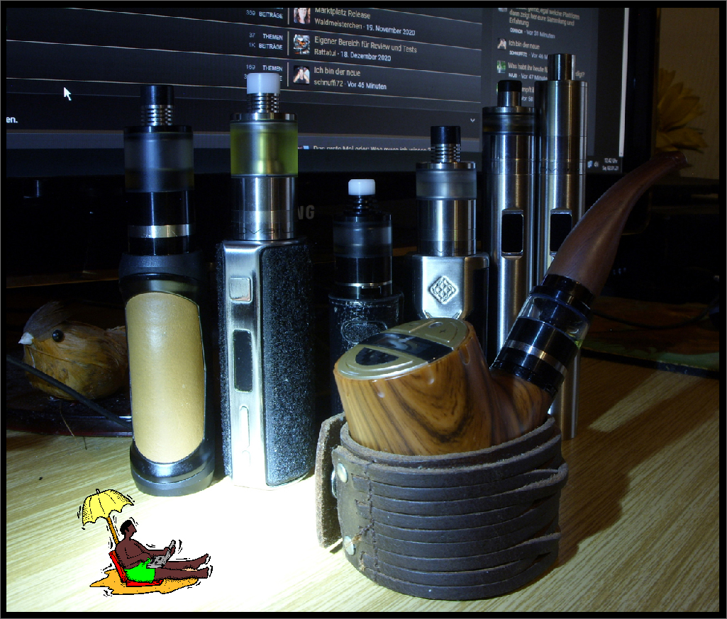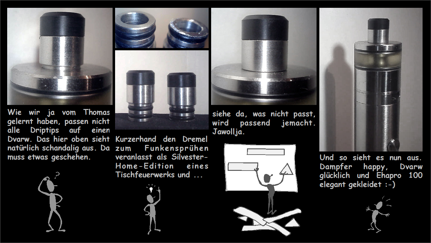 Diese Driptips habe ich in etlichen Variationen schon ganz früh ausprobiert und ausgeschlossen. Nein, sie passen mir (!) nicht. Entweder zu lang oder zu breit oder zu nicht-schlicht. Auch deren Design-Klone aus Holz passen hier m.E. nicht, da die schlichte Tube eigentlich ein schlichtes Driptip "ohne alles" erbittet, also selbst die Kühlrippen in meiner Auswahl sind bei 16 Watt ja nu wat arg angeberisch. Wie ein VW-Käfer im Porsche-Chassis