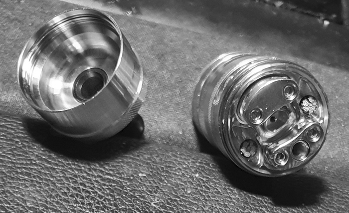 Um an dieses Wickeldeck zu kommen muss man die TopCap samt Dampferkammer (die sog. "Luftzufuhrabdeckung") abschrauben, was aber recht schnell geht, da das Gewinde recht kurz ist und alles somit recht fix abgedreht bzw. anschließend das Deck wieder geschlossen bzw. zugedreht werden kann. Dabei läuft dieses Gewinde butterweich und ist gegen ein Auslaufen mit einem O-Ring gesichert. ...