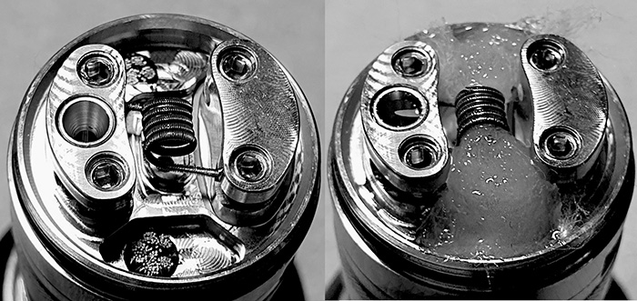 Das nun sichtbare Wickeldeck kommt mir doch irgendwie bekannt vor und wurde wahrscheinlich in ähnlicher Form schon für den Verdampfer Gevolution in dieser Nierenform gestaltet?! Lediglich die konisch geformte Liquid-Füllöffnung zwischen den linken, beiden Pfostenschrauben ist neu, wo man recht einfach den gefederten Tankverschluss mit der Liquidflasche aufdrücken kann, um den Tank mit bis zu 5 ml Liquid zu befüllen.