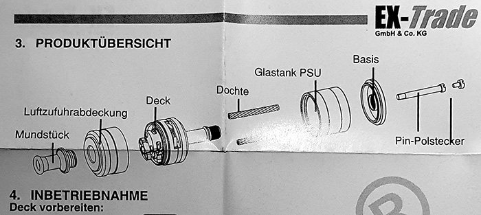 Mitgeliefert wurden die üblichen O-Ringe, Ersatzschrauben und 2 vorgefertigte Wicklungen samt einem Inbusschlüssel zum Drehen der Dochtschrauben. (Unten links sieht man auch noch die Aufnahme von der Basis, wo der Name samt Seriennummer und Vertriebsadresse eingraviert sind.)
