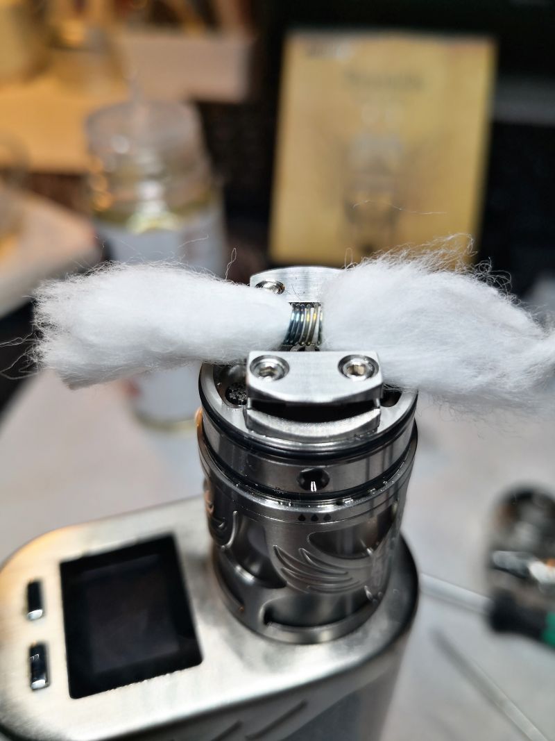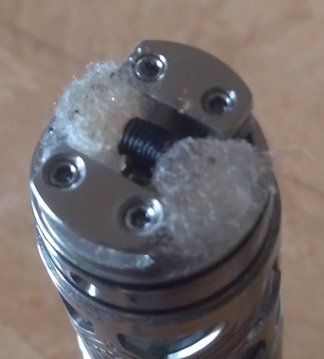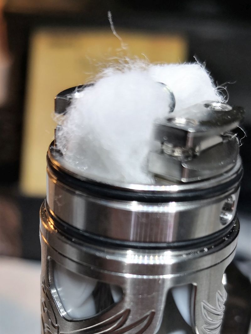 Mit Watte braucht man bei ihr nicht zu sparen, wenn man die Watte gut auf die Dochte setzt, gibt es kein Problem mit dem Nachfluss. Ich kann den Tank ohne Probleme bis zum Boden leeren.