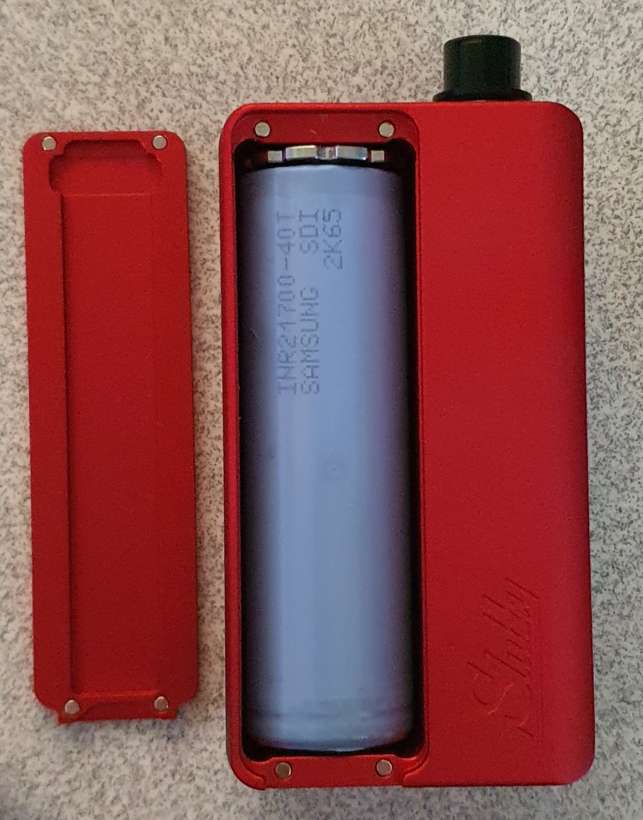 1.) Hinter einem Panel wird der Akku verhüllt, der eingeklemmt ursprünglich mal ein 18650er Akku war. Mittlerweile ist der Nachfolger der Box ein klein wenig vergrößert worden (ca.4 mm), so dass jetzt in diese Kammer auch ein 21700er Akku passt, was ich mir jetzt hier gekauft habe, wenn auch die erste, etwas schlankere Variante mit den 18650er Akkus immer noch zahlreich angeboten wird: