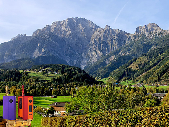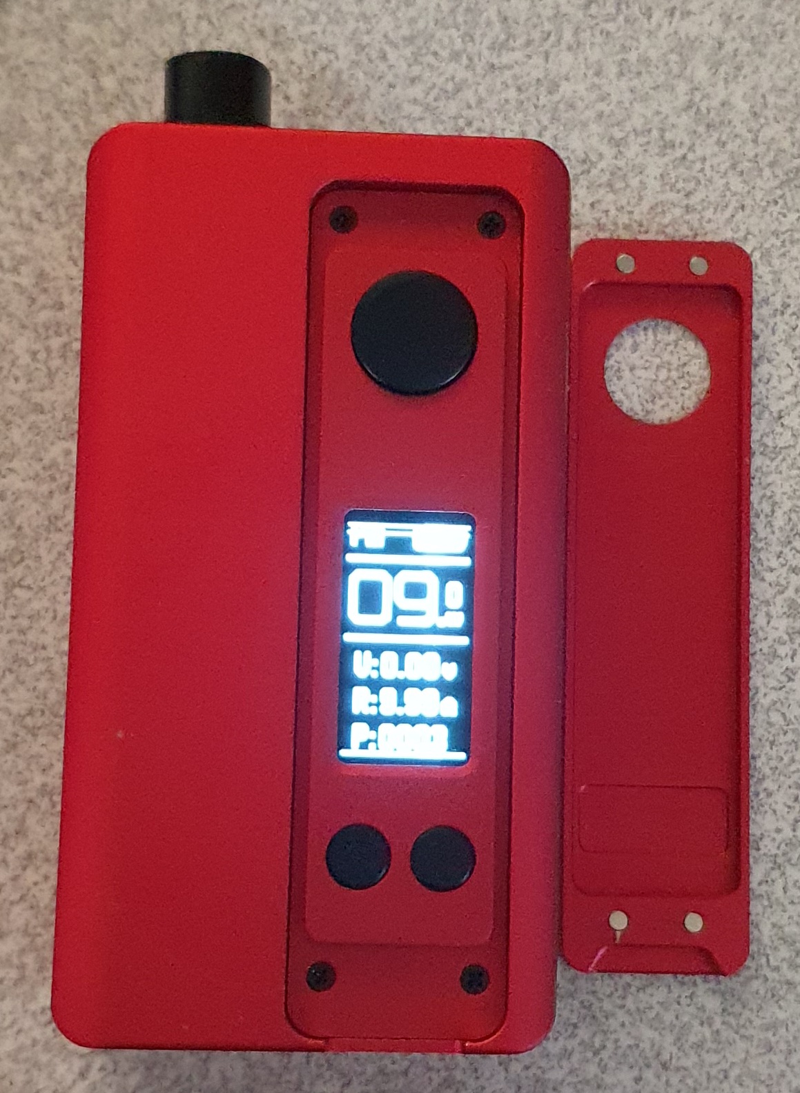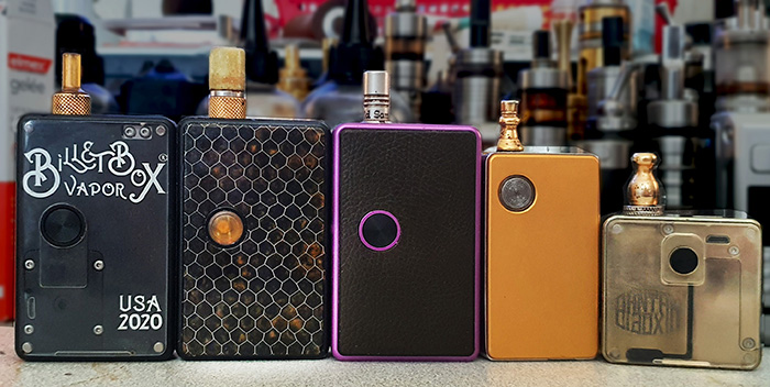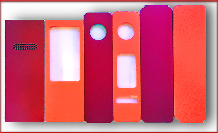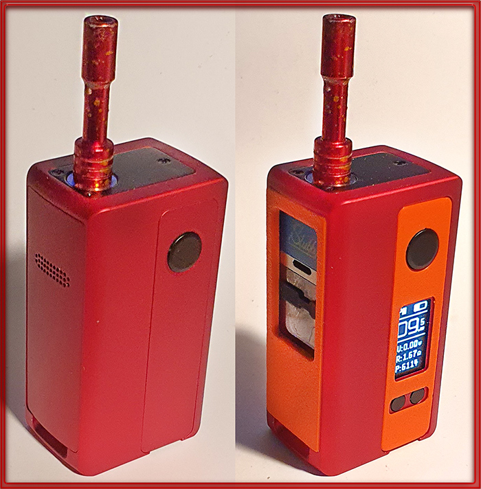 Meine Box ist ein wenig dicker als eine Billet- oder DotMod-dotAOI-Box (auch durch die jetzt mögliche Nutzung von 21700er Akkus). Die Box liegt aber trotzdem gut in meiner Hand. Sie besitzt farblich eloxierte Aluminium-Seiten mit mittlerweile zahlreichen Farbvarianten. Die drei Türen oder Panels, die ebenso in zahlreichen Farben per 3D-Drucker u.a. im ebay angeboten werden, verdecken jeweils drei Kammern oder Hohlräume:
