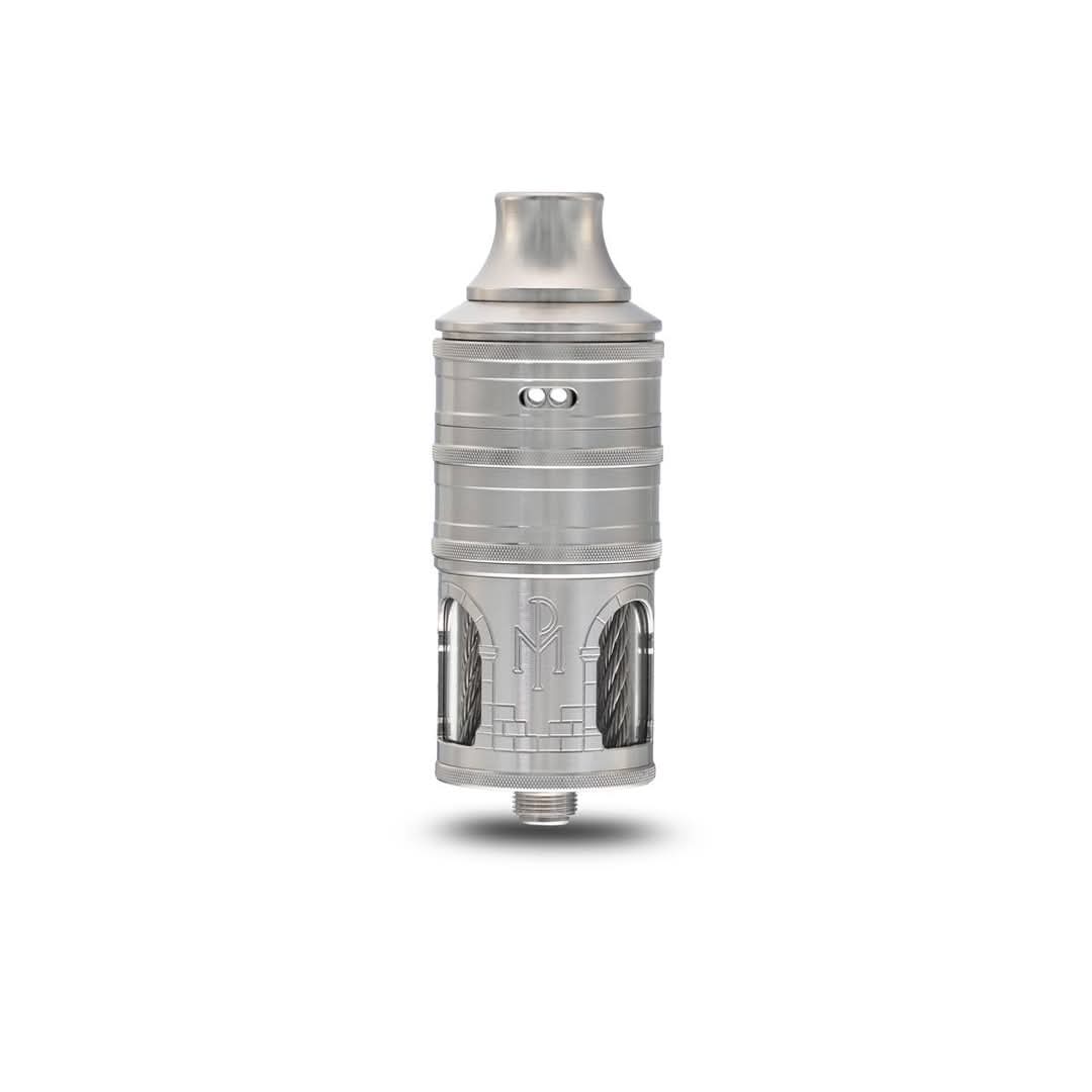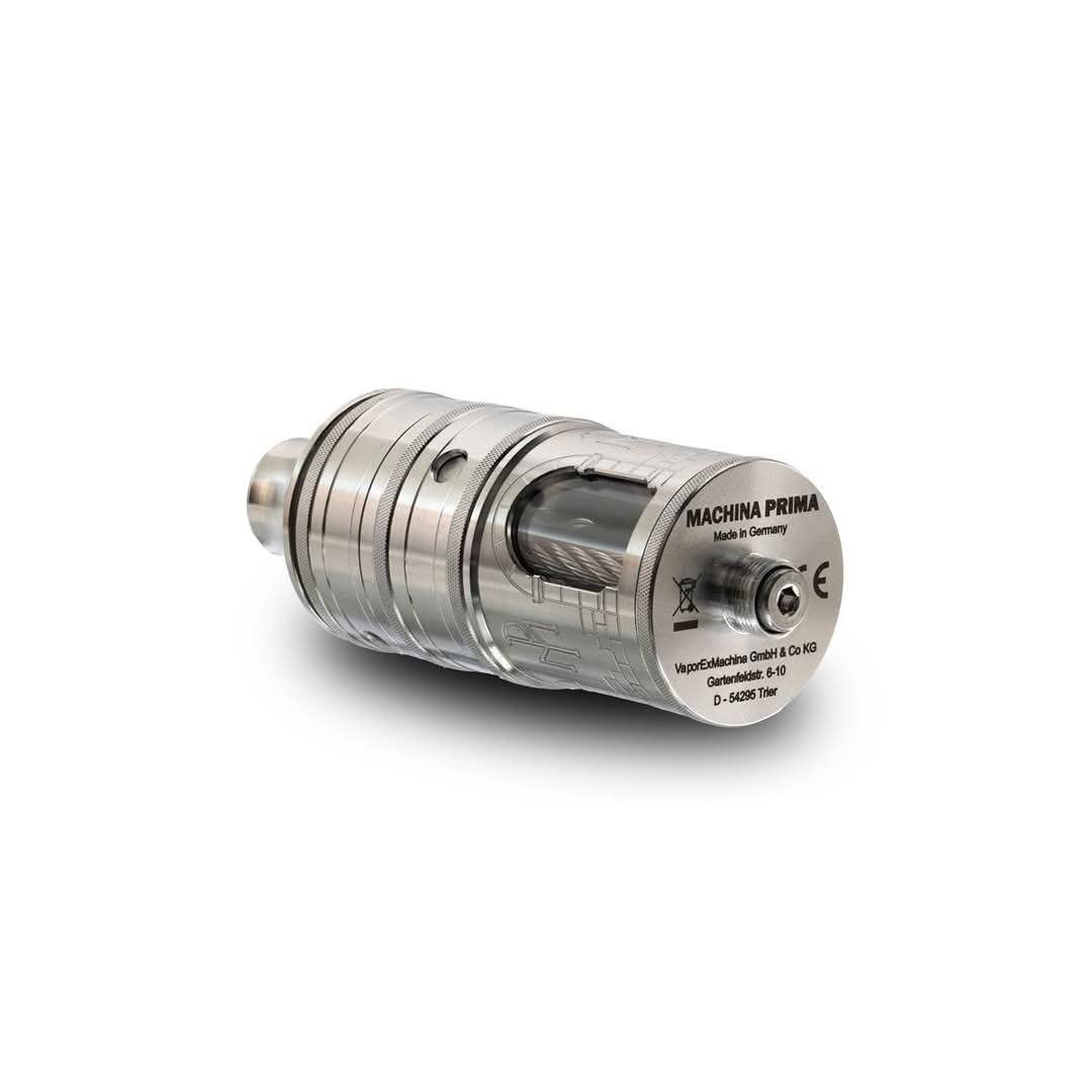 Die Machina Prima ist ein 23 mm Verdampfer und basiert untenrum auf dem Taifun GX. Hier wurde das Füllsystem und der Auslaufschutz übernommen. Die Luftführung ist aus einem Stück in der Cap gefertigt.Die Airflow wird mit zusätzlich erhältlichen Caps getauscht
