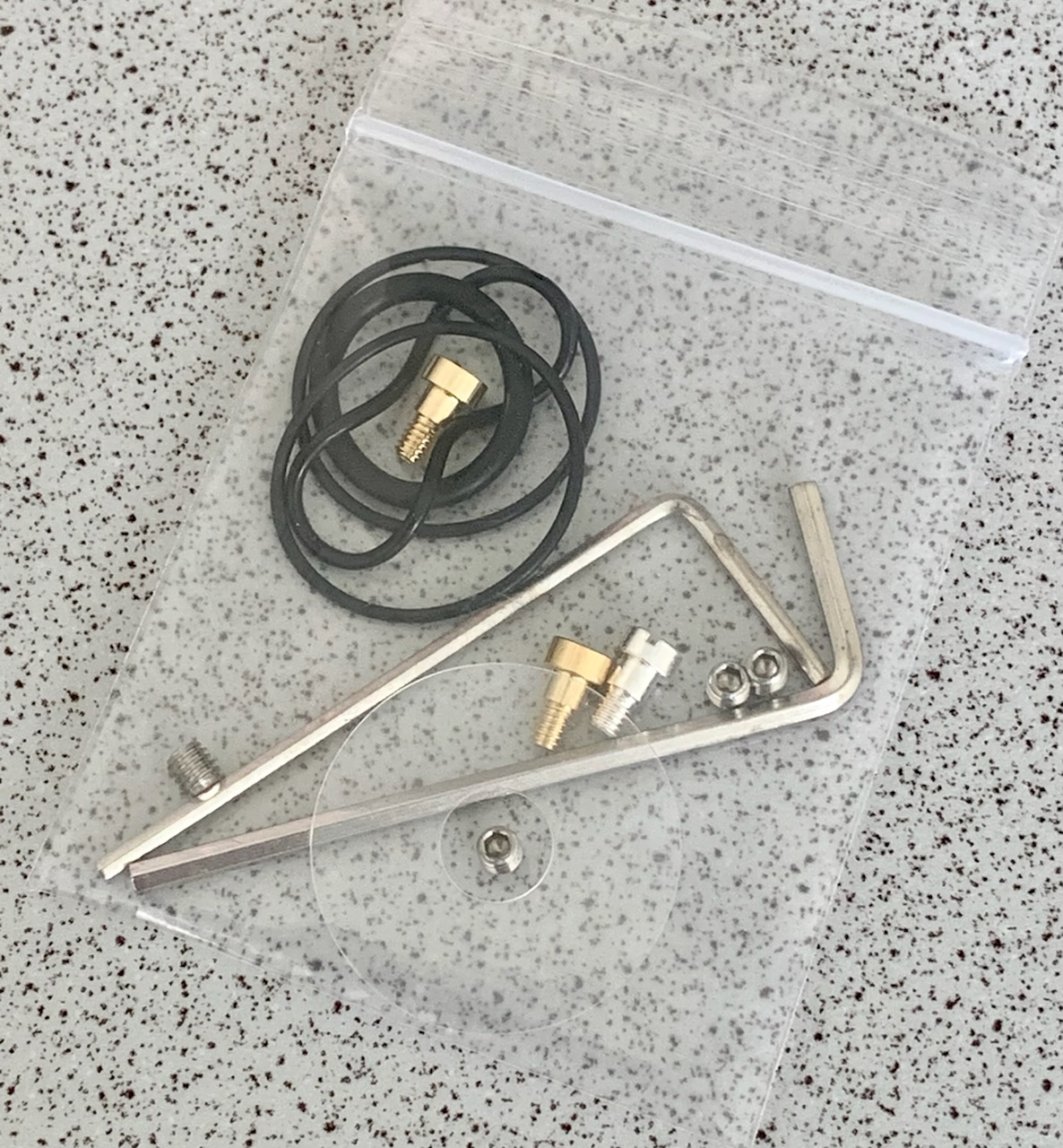 Ein Ersatzteiltütchen mit erfreulich großem Umfang: O-Ringe, Madenschrauben, eine transparente, dünne Unterlegscheibe gegen Verkratzen des Mods und 2(!) vergoldete Squonkpins und ein Ersatz 510er Pin.