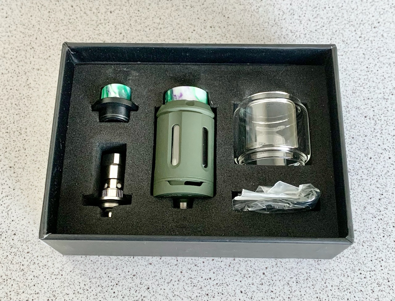 Enthalten sind: der Verdampfer, ein Bubbleglas, ein 510er Drip Tip mit 810-Adapter, Ersatz-O-Ringe und noch eine MTL-Coil mit Adapterhülsen.