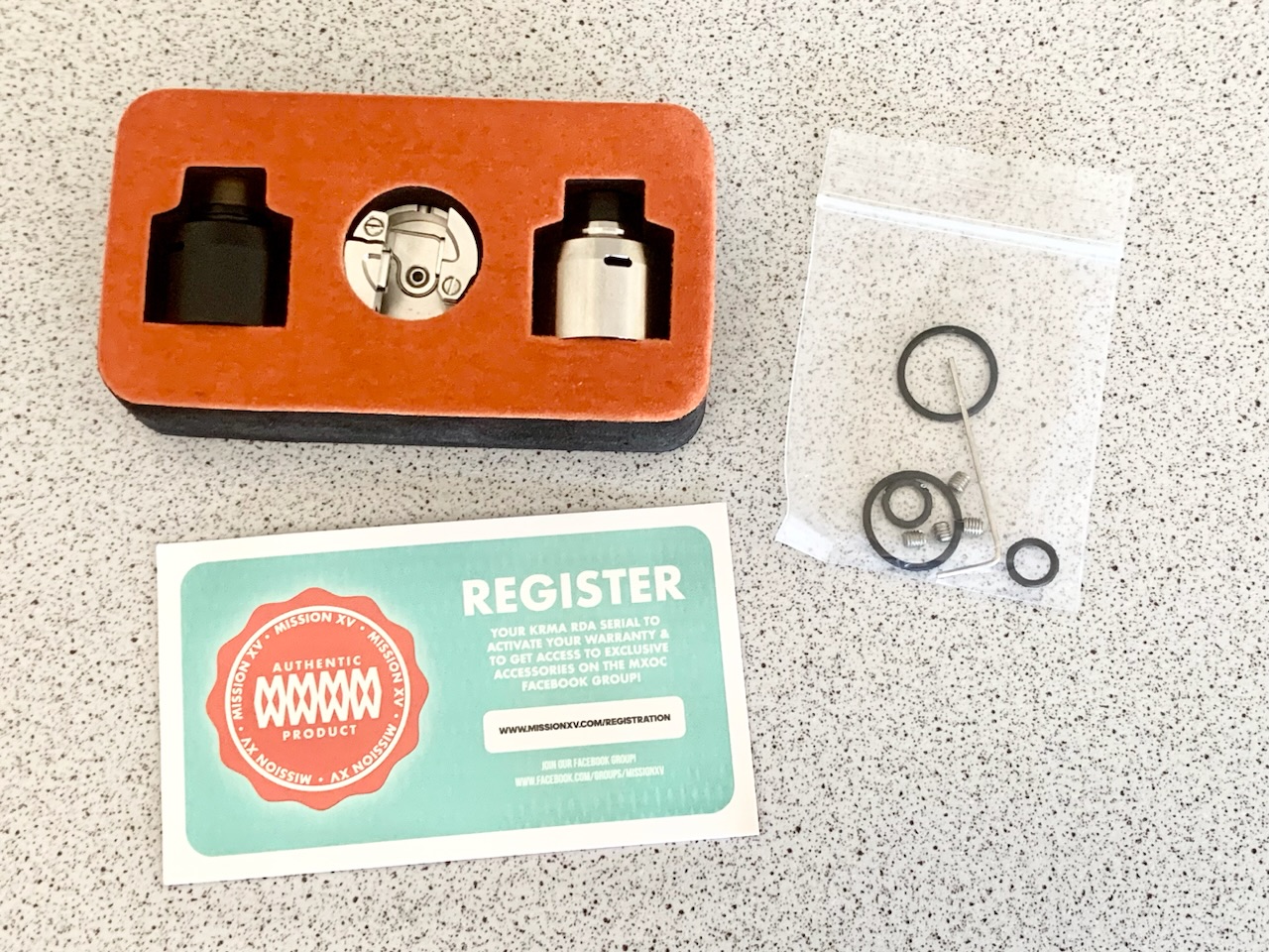 Enthalten sind: das Deck mit zwei Caps (Edelstahl und schwarzer Kunststoff), zwei Drip Tips (schwarz und Ultem), Ersatz-O-Ringe und Schrauben, Registrierungskärtchen und Inbusschlüssel.