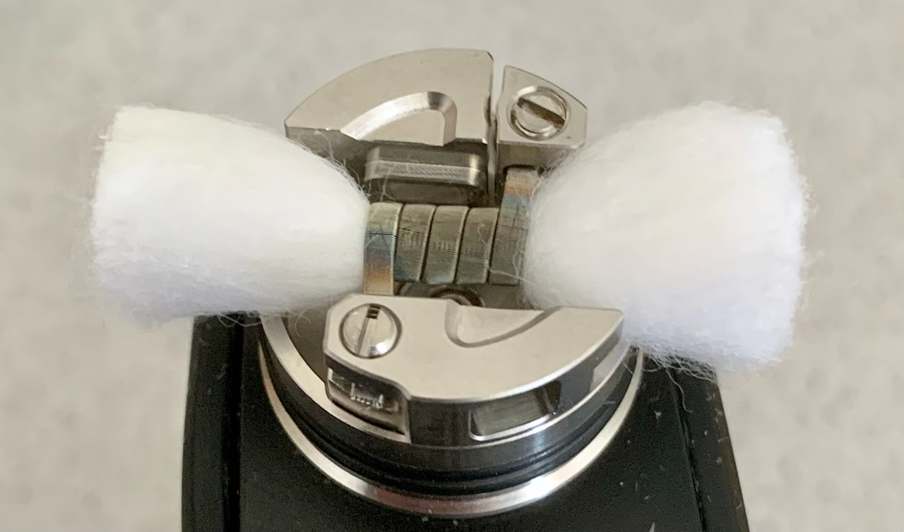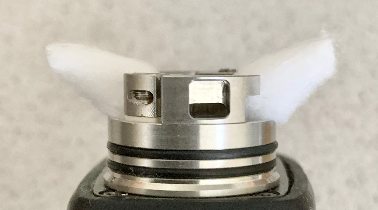 Die Watte schneide ich Squonk RDAs immer schräg ab. Beim Verlegen darauf achten, dass die Airflow frei bleibt. Es empfehlen sich breitere Coils.