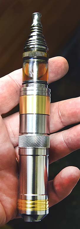 Der Russian BIG war echt nett. 31mm Durchmesser (glaub ich). Der kam einige Zeit vor dem dicken Kayfun raus, trotzdem wurde der Kayfun als das Original bezeichnet xD Der hatte 18ml Tankinhalt. Für einen MTL Verdampfer eine riesige Menge Liquid. Ich hab damals schon Watte als Dochtmaterial benutzt, was bei Coils aus 0,2mm Kanthaldraht mit einem Innendurchmesser von 1,5mm eine ziemliche Friemelei war. Hat sich aber gelohnt.
