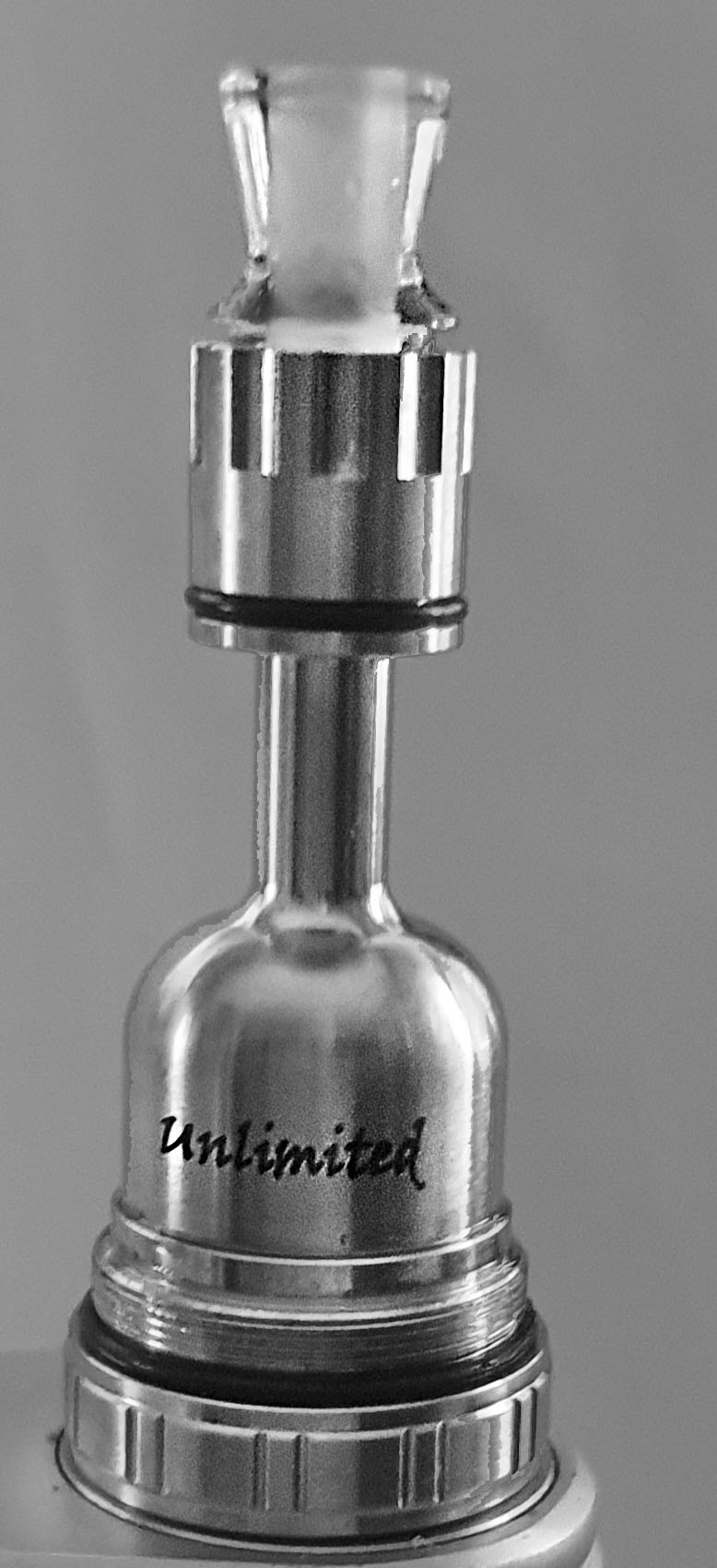 Diese Krone samt aufgesetztem DripTip ist mit dem Kamin und dieser unten mit der Dampferglocke verbunden (vergleichbar mit dem Diplomat u.a. VDs) Die Glocke sitzt unten am Deck in einem Gewinde, das auf oder zugeschraubt werden kann, um damit den Liquidfluss zu beeinflussen. Ab ca. 3 Aufschraub-Drehungen des Gewindes beginnt sich der ovale Liquidzufuhrschlitz im Deck langsam zu öffnen und man kann somit selbst bestimmen, wieviel Liquid zu seinem selbst gewählten PG/VG-Verhältnis (dick- oder dünnflüssig) passt und für eine optimale Geschmacksentwicklung angesogen werden soll.