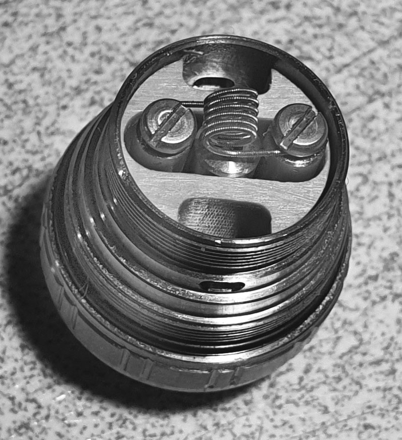 Außerdem könnte die Gefahr dann auch größer sein, dass u. U. Liquid in das Luftloch fällt, wenn man die Wicklung für einen starken Geschmack besonders nahe am Luftloch platziert. (Einen ähnlichen Volumenreduzierer habe ich übrigens auch schon zusätzlich in jedem meiner FeVs erfolgreich eingebaut!)