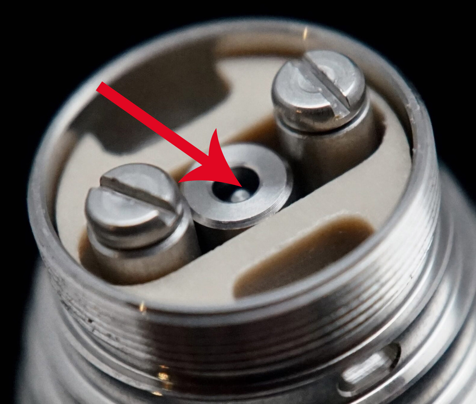 Auch beim MooD wird also solch ein konischer Innenstift im hohlen Pluspolstift benutzt, um die Luftmenge direkt unter der Wicklung (durch Zu- oder Abnahme der Dicke des konisch zulaufenden Stifts zum Luftloch unter der Wicklung) sehr genau zu regeln. Hat man seinen MooD mit Wicklung und Liquid bestückt, kann problemlos mit einem Schlitz-Schraubenzieher dieser Stift am Pluspol hoch oder runtergedreht werden, um einen fächerartigen Luftstrom direkt unter die Wicklung zu liefern. Auch wenn man diese Methode schon kennt, es ist und bleibt eine angenehme Sache, den Luftstrom ultrafein einstellen zu können, ohne gleich seine komplette Wicklung abbauen zu müssen. Hier der Blick auf die Luftführung mit dem spitzen Reduzierstück im Luftkanal direkt unter der Wicklung (siehe Pfeil):