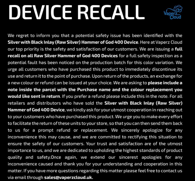 2. Februar 2024 um 22:26 #1 Ahoi#Auf der Titanic fand ich eben folgenden Hinweis :Hammer of God 400 ( Raw Silver ) Hersteller Rückruf ! ! ! Hoffe das betrifft euch nicht so sehr wie mich !MfG , 3ME ° ° ° ° ° ° ° ° ° ° ° ° ° °
