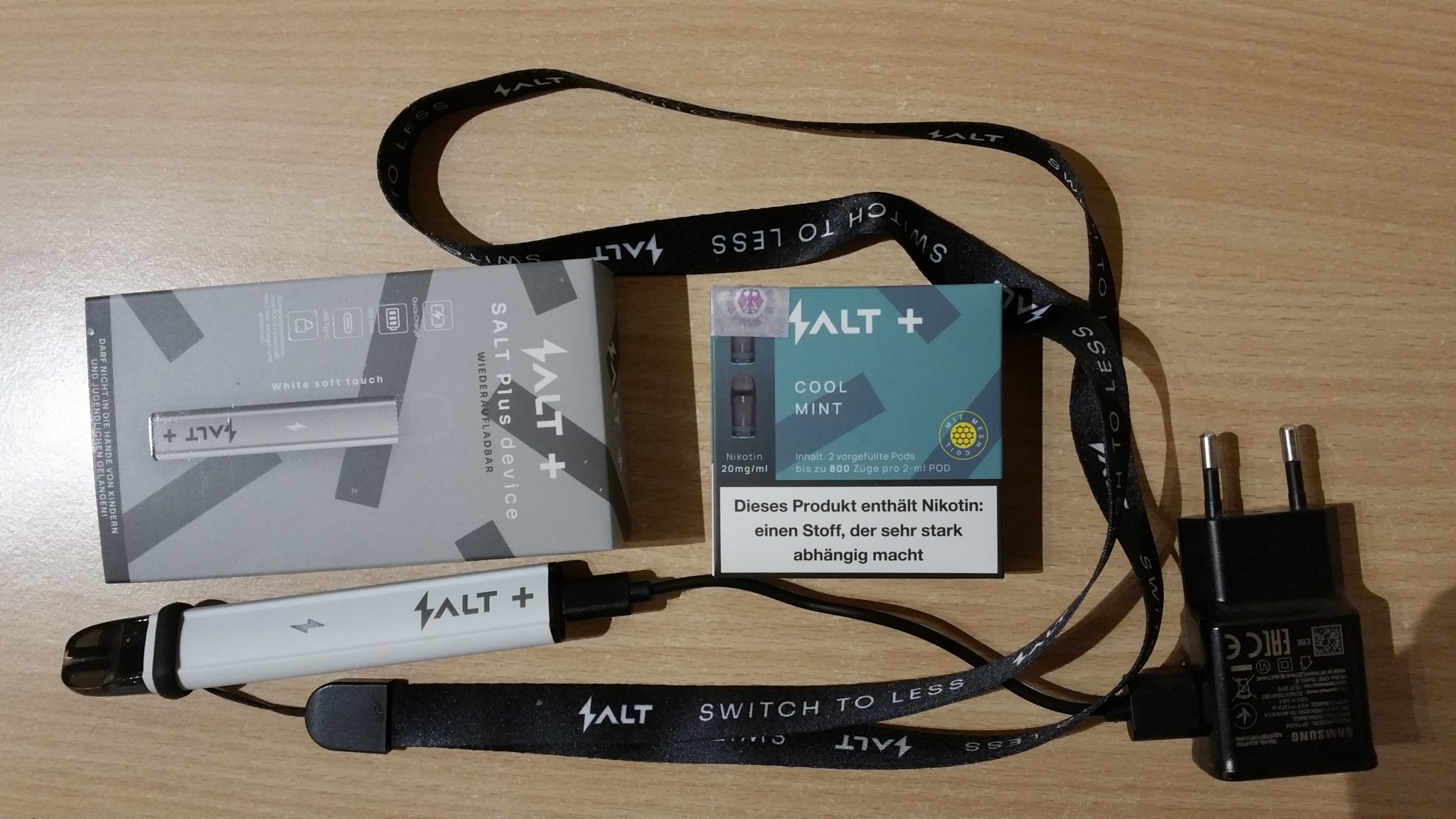 Ich bin noch Neuling bei E-Zigaretten und habe erst vor gut 2 Monaten (Ende März 2024) damit angefangen nachdem ich über 50 Jahre Tabak rauchte. Hatte bei einem Händler, bei dem ich zuvor Tabak und Hülsen zum Stopfen kaufte zufällig eine Packung Einweg-Pods SALT PLUS Cool Mint entdeckt. Er erklärte mir das SALT PLUS Pod-System und dass ich dazu das Starterset mit dem Akku benötige. Ich hatte es zusammen mit den beiden Einweg-Pods Cool Mint probeweise als Ersatz für die mittlerweile verbotenen Menthol-Zigaretten gekauft. Das SALT PLUS Pod-System ist in (derzeit) 4 Farben erhältlich, hat ein stabiles Alugehäuse mit einer USB-C Ladebuchse und einen 500 mA/h Akku der über das beiliegende Kabel oder dem Ladegerät vom Smartphon aufgeladen werden kann. Der jeweilige Zustand des Akkus wird beim Laden oder Vapen über eine gut sichtbare farbige LED angezeigt. Das Gerät kostet rund 10 Euro, eine Packung Einweg-Pods für ebenfalls 10 Euro. Dazu schenkte er mir ein Band zum Umhängen das mit einem Silikonring am Starterset befestigt werden kann und ich somit beim Gehen beide Hände frei habe.