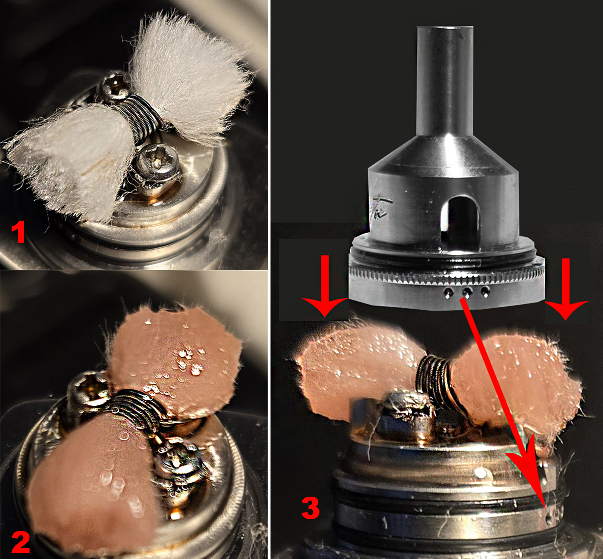 Um ein Überdrehen und Verklemmen von Kammer/Kamin und Flüssigkeitsöffnung zu vermeiden hat man das Gewinde der oberen Kappe im Uhrzeigersinn - und das Gewinde der Flüssigkeitsöffnung gegen den Uhrzeigersinn gemacht, da ein falsches Aufdrehen wohl allgemein bei den RTA's des öfteren passiert. Dieses falsche Öffnen soll nun durch die beiden gegensätzlichen Gewinderichtungen vermieden werden.