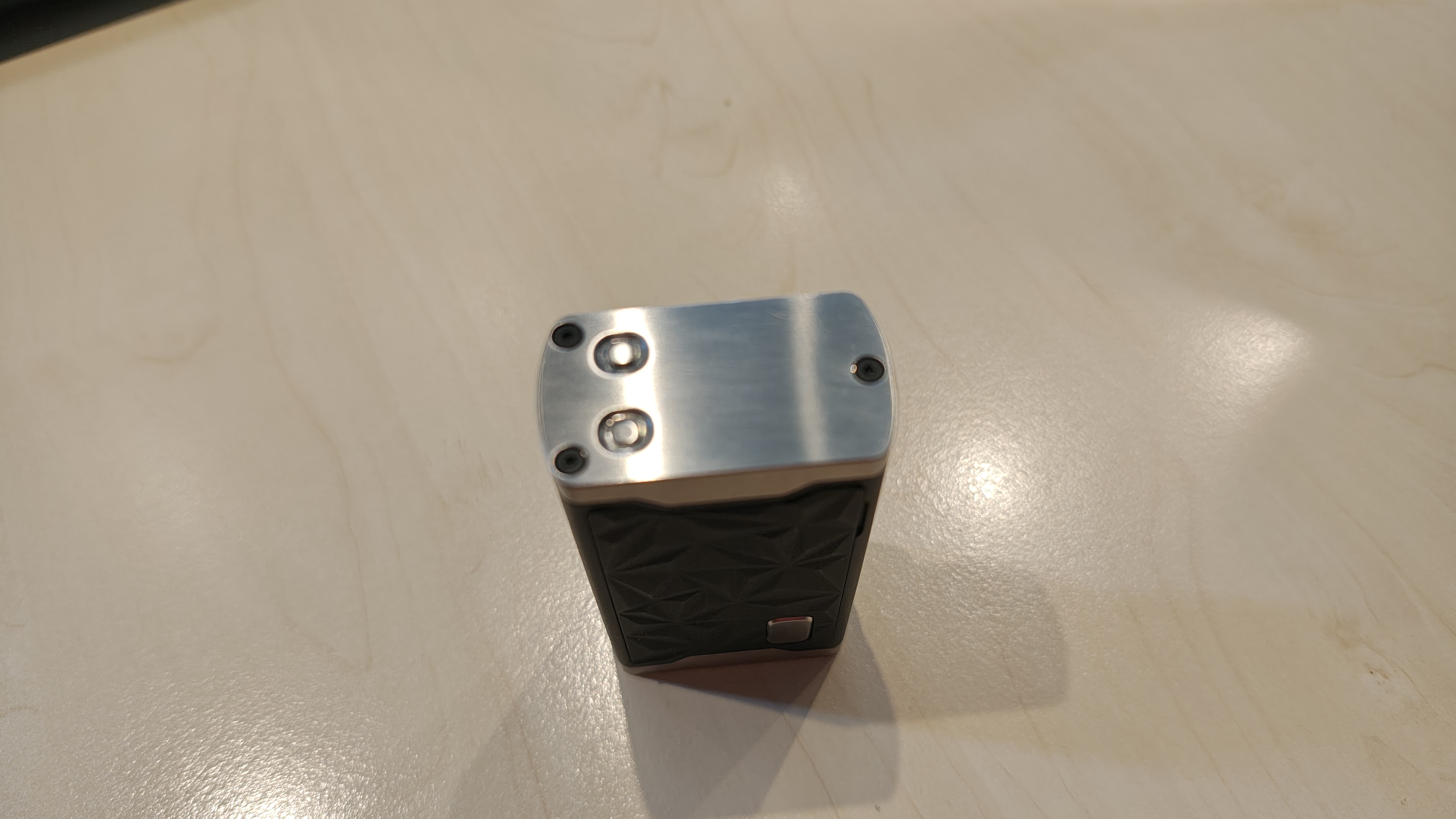 Der Körper der Box ist aus schwarzem Delrin, Feuerknopf und die Platten oben und unten sind aus gebürstetem Edelstahl, die "Doors" aus schwarzem PC.