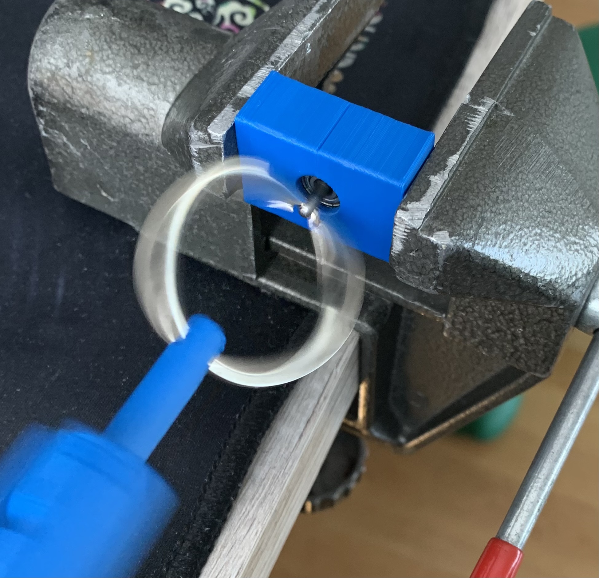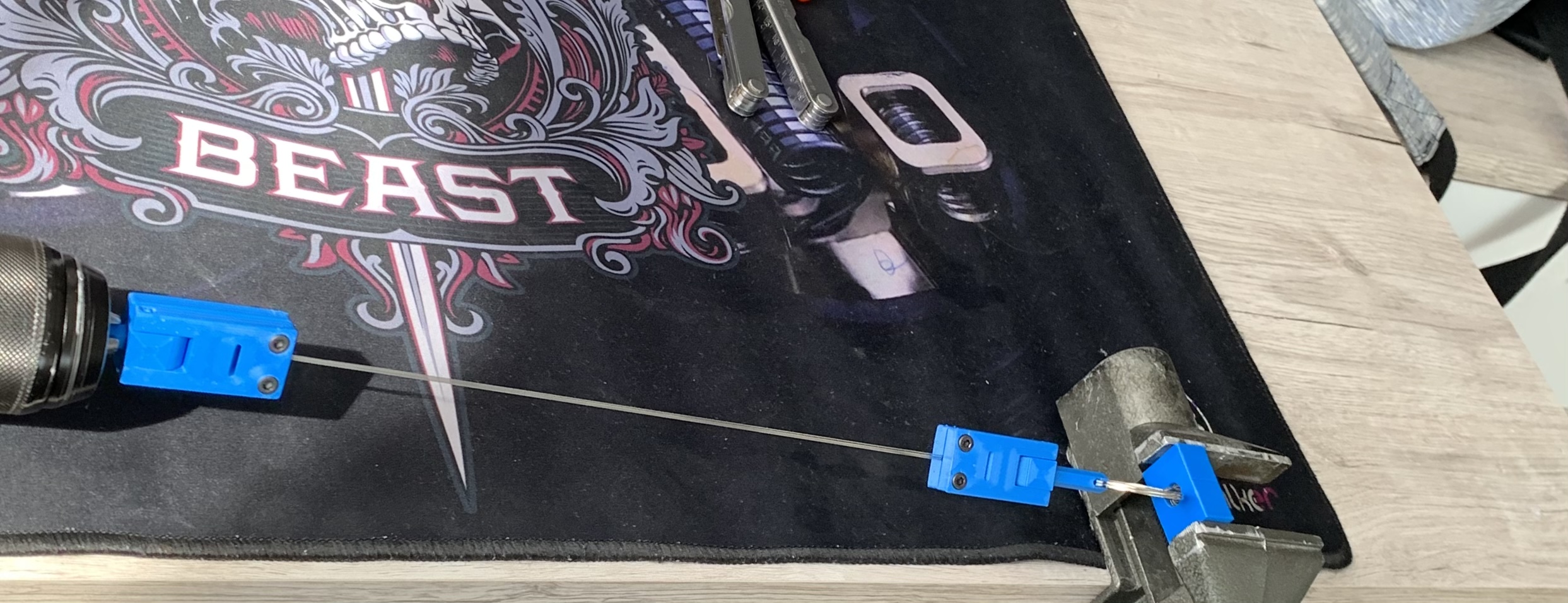 Nach dem ich heute diverse Sachen im Garten gemacht hab, hab ich mir endlich mal eine Halterung für den Daedalus gebastelt, damit ich den nicht immer festhalten muss. Musste klein und Esstisch-kompatibel sein, als einfach ein Brett genommen, 25cm abgesägt, 2 Winkel drauf geschraubt und fertig. Das kann ich nun mit einer Schraubzwinge am Tisch befestigen und damit die keine Schrammen macht, noch schnell 2 kleine Streifen gesägt, die zwischen Klemme und Tisch kommen. Ok, wenn schon gebaut, musste auch schnell mal ein Draht gebaut werden.