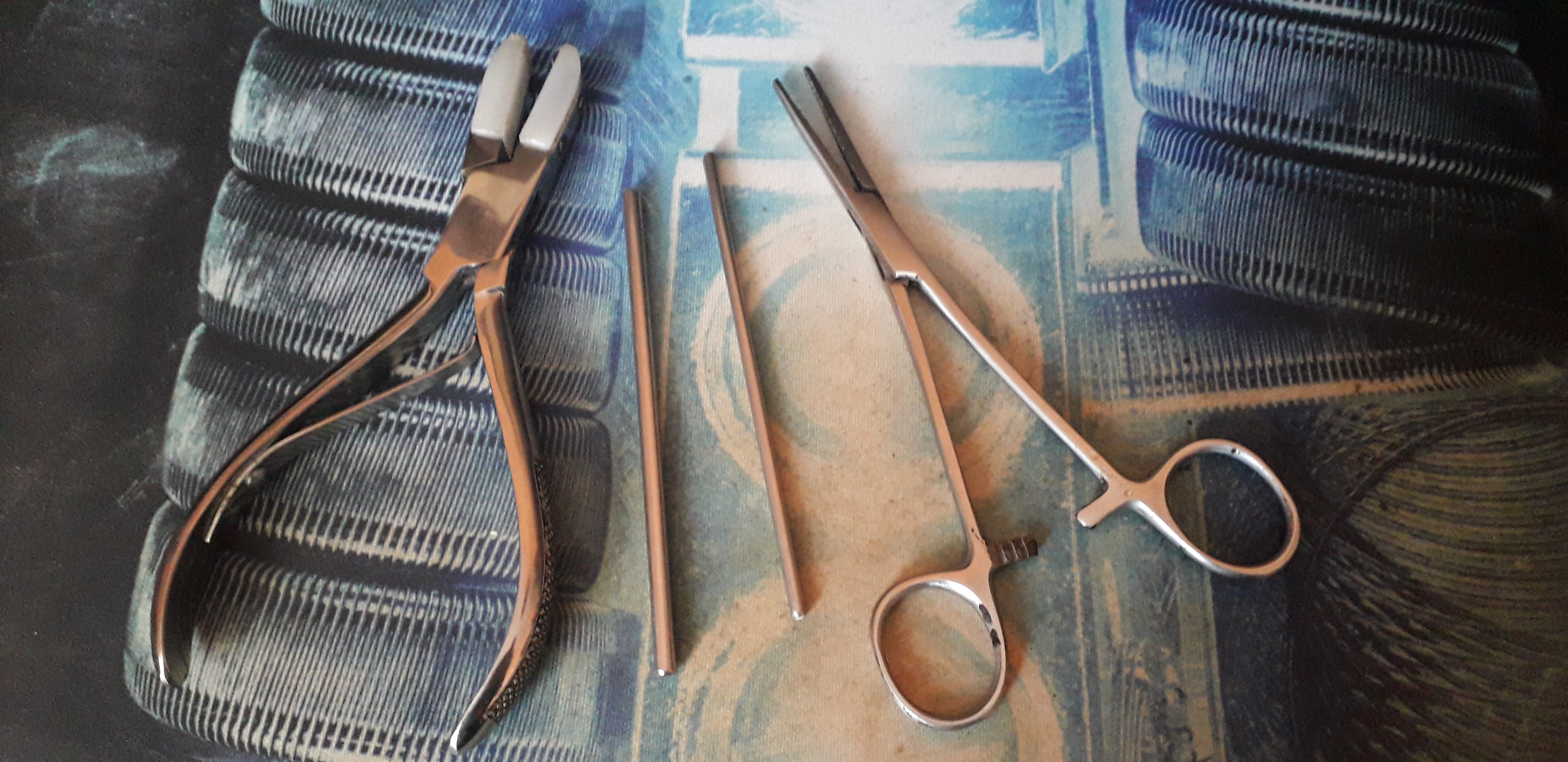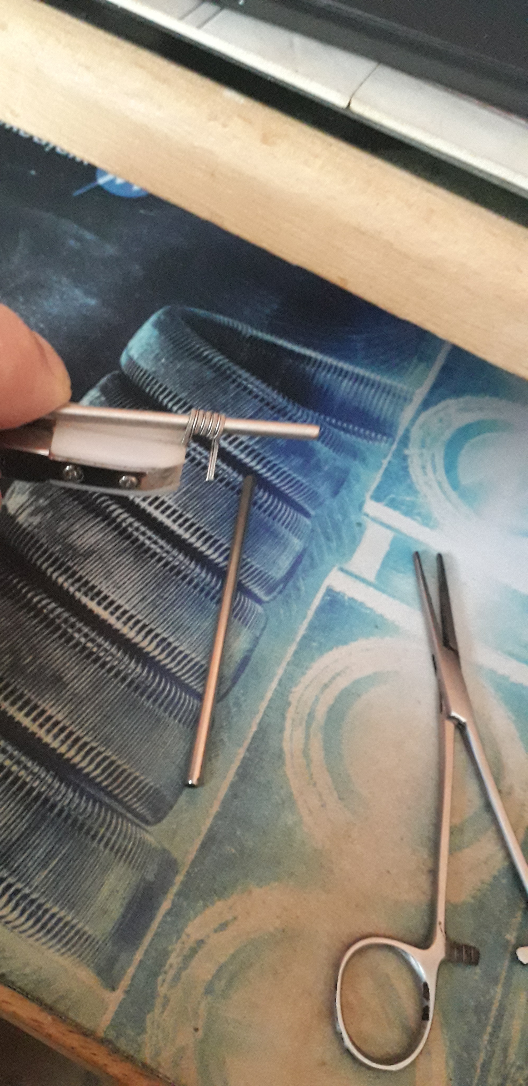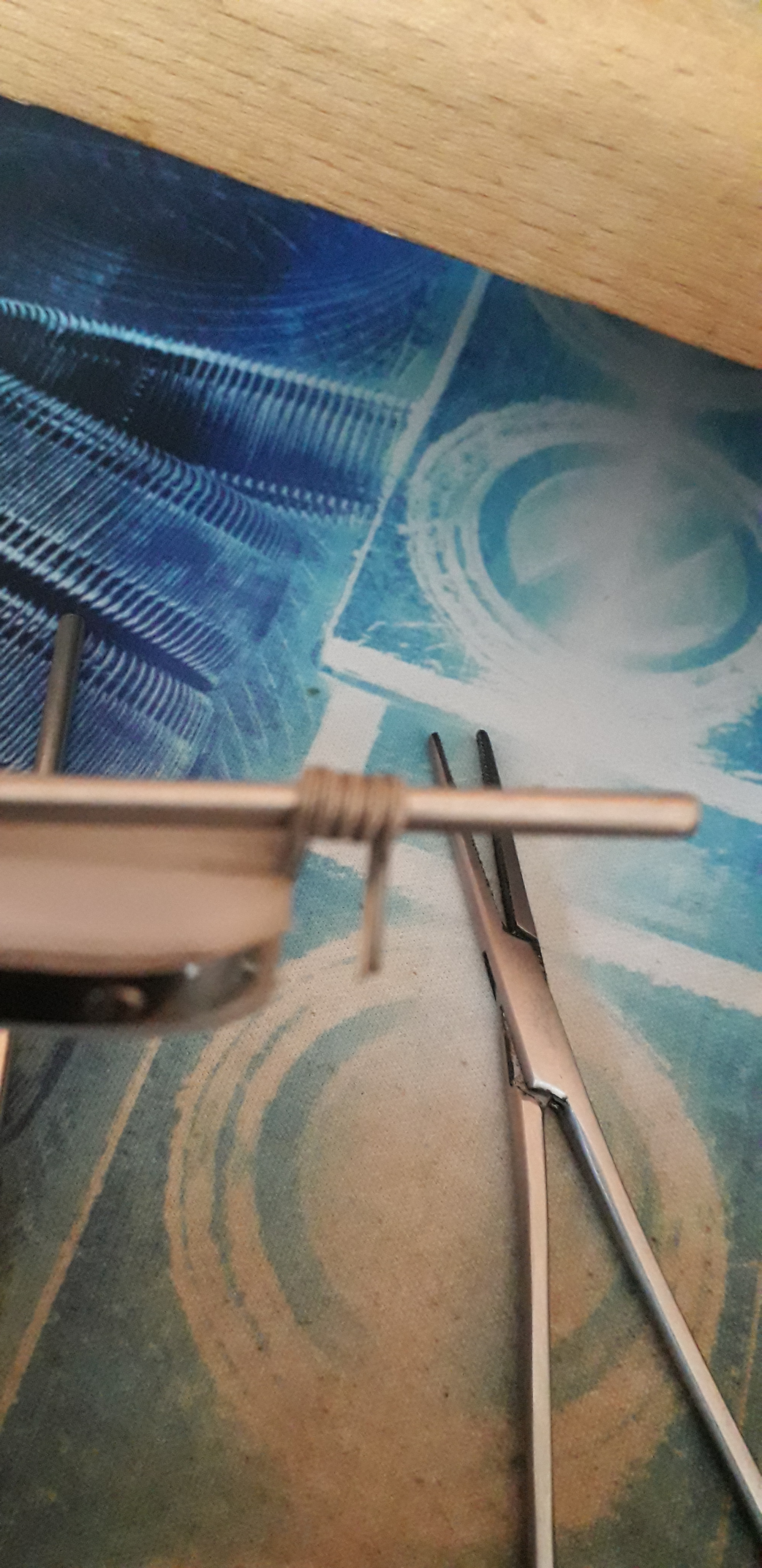 Auf die Idee mit der Arterienklemme hat mich der Mounty bei You Tube gebracht -- damit kann man ( ich ) auch komplexere Coils wie Fused Clapton , Aliens und Co richtig schön stramm und kotrolliert um die Wickelstäbe bringen ohne das man den Manteldraht von den Kernen runter zieht