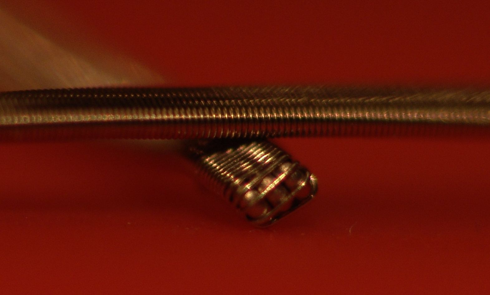 Mit 3,5mm ID hab ich den Draht dann mit 5,5 Windungen zu einer Coil verarbeitet, die bei 0,32 Ohm landen sollte (dual natürlich dann bei 0,16).