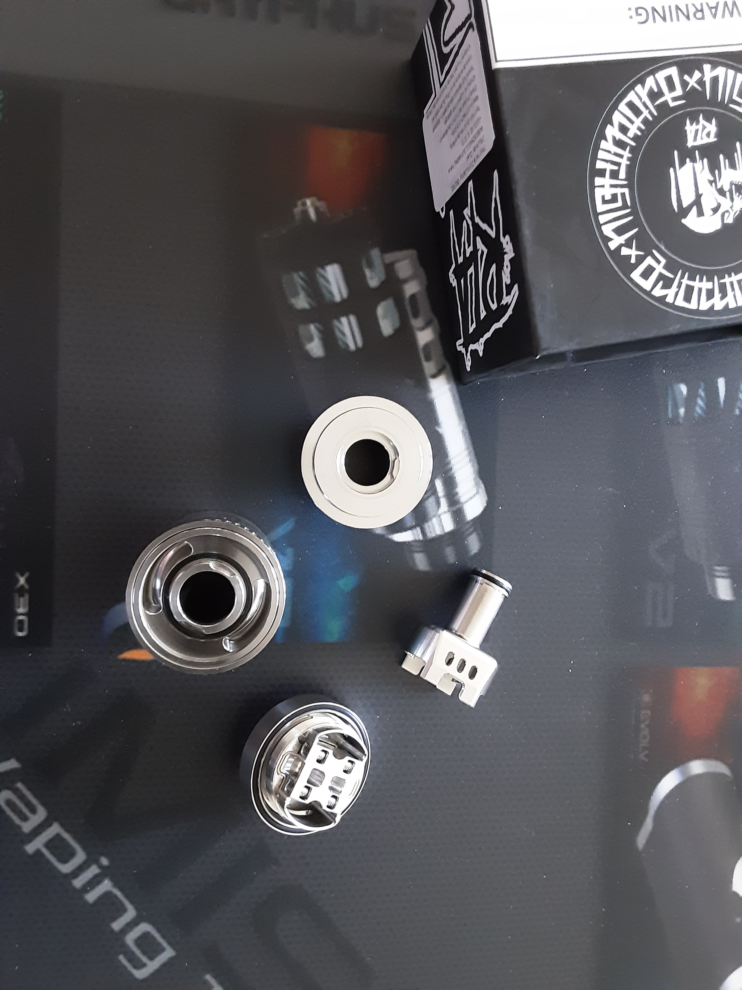 Der 28mm breite Verdampfer besitzt ein postless Deck, einen Reduzierkamin, Bajonettverschluss an der Topcap