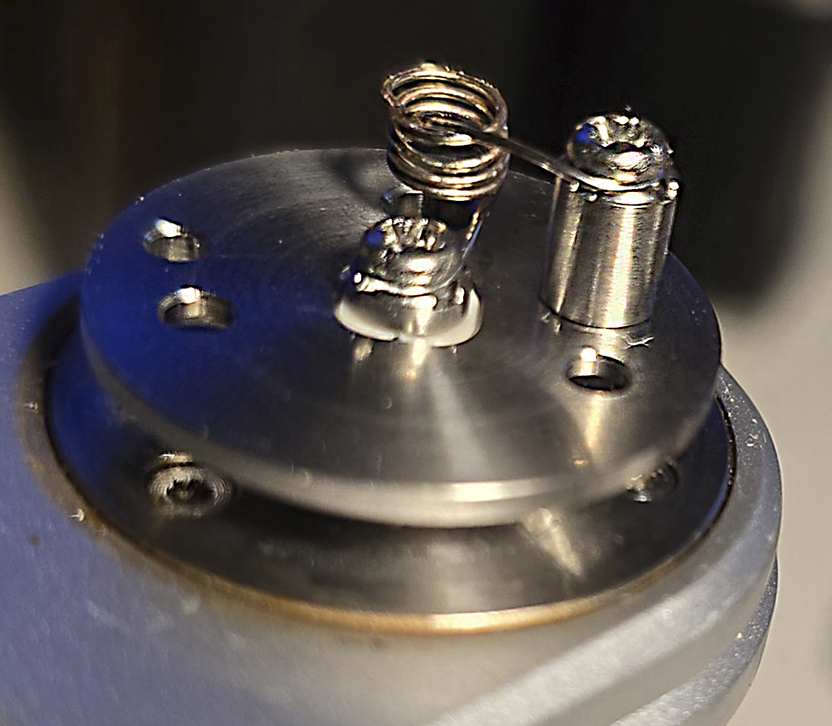 Nachdem ich erst im Film gesehen habe, welche Schrauben man öffnen muss, um an das Innere der Basis zu kommen, war es danach an der Zeit, hier eine stehende Wicklung zwischen die beiden Pole zu bauen, was ich dann mit meinem Standard-Stahldraht auch getan habe - mit dem Ergebnis: Es sind nun 0,6 Ohm geworden, was ich dann später mit 10 Watt befeuern werde.
