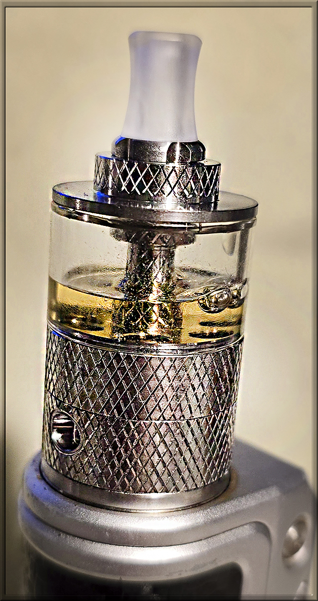 Der Stahl dieses VDs ist hübsch gelasert, sieht aber trotzdem recht schlicht aus. Der Geschmack ist hervorragend, da immer genügend Liquid ohne Abriß zur Verfügung steht. Man muss aber ein wenig mit der Watte fummeln, damit sie genau unter dem Liquidzufuhrloch positioniert wird. Sonst läuft nämlich das Liquid doch nach und nach über seine Finger, was mir zu Anfang auch passierte. Also galt es, alles wieder aufzuschrauben, um mit einem Stückchen Watte die Zufuhr des Liquids nicht nur abzudichten, sondern dadurch auch die Menge des Liquids ein wenig genauer zu dosieren, so dass nach dieser Verbesserung alles am Ende doch zur Zufriedenheit klappte bzw. immer genügend Liquid zum Verdampfen an die Wicklung fließen konnte!