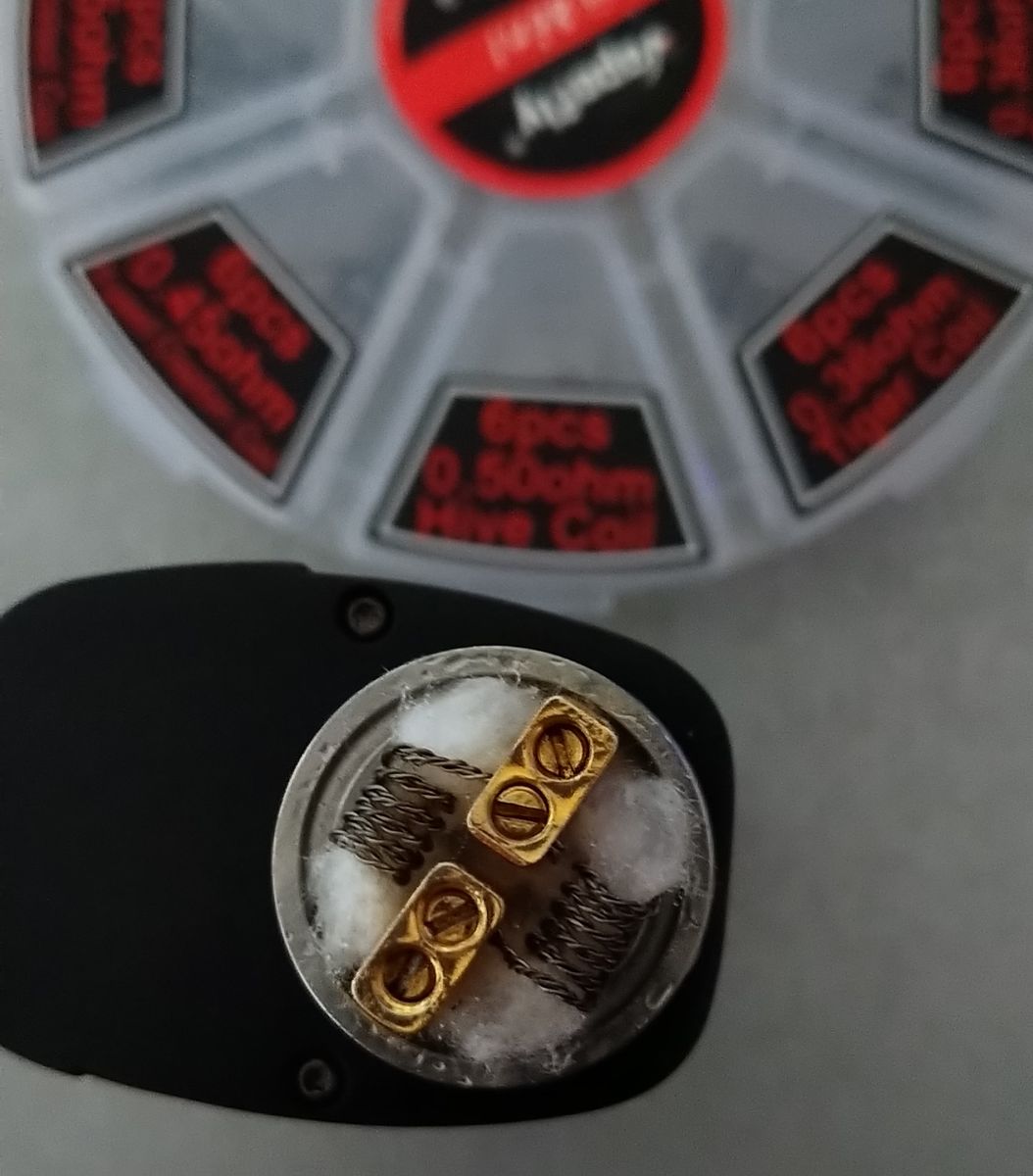 Aktuell habe ich mal die Coils wieder getauscht von den Hive Coils (die aufn Bild), mit einer Windung mehr als ausgeliefert, zu den Claptons aus der selben Packung mit den Standard 4,5 Umdrehung eingebaut und die machen schon mehr Dampf.