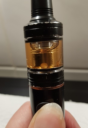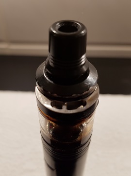 Das Liquid wird eingefüllt, indem man das DripTip ein wenig herauszieht und dann den Verschluß oben zur Seite schiebt. Dann kommen zwei Öffnungen zum Vorschein. Man sollte die kleinere zum Befüllen nehmen, damit durch die größere die Luft ausweichen kann.