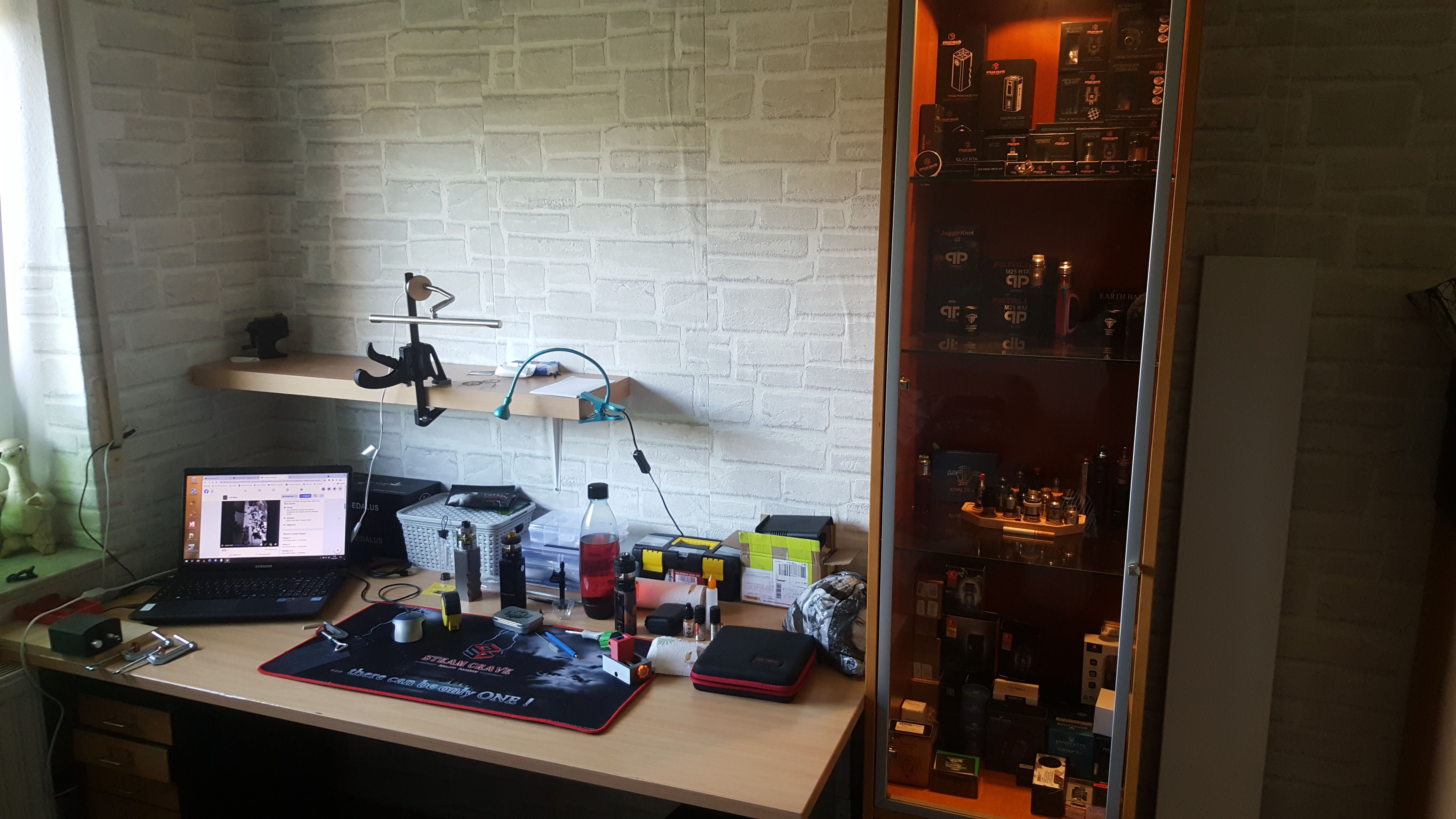 Noch nicht ganz rund, an der Wand fehlen noch Regale und Boxen und der Laptop soll auf nen Schwenkarm, aber meine kleine Dampf- und Bastelecke gefällt mir schon mal soweit. Vor allem der Tisch ist mit seinen 80x160cm schön gross