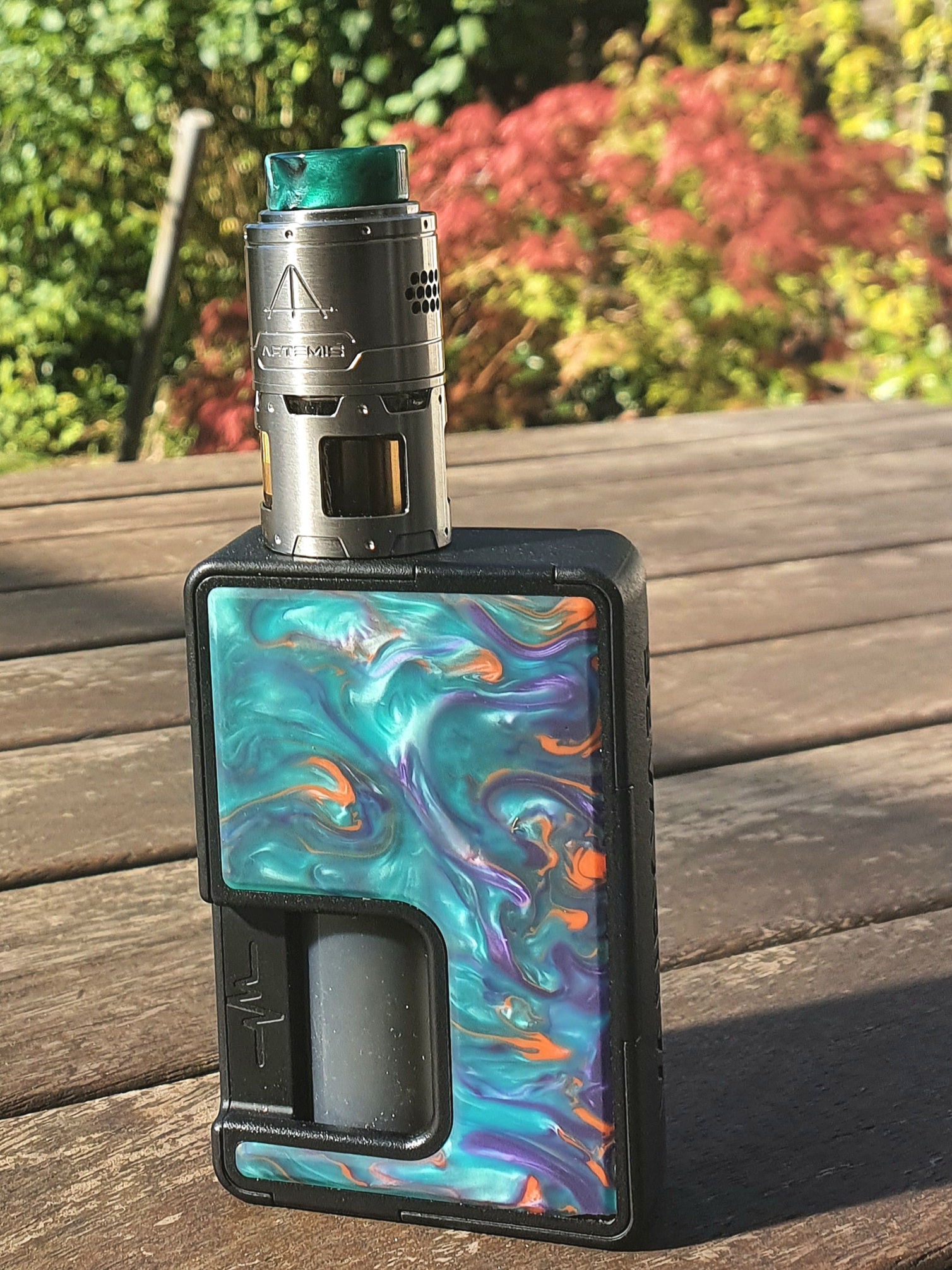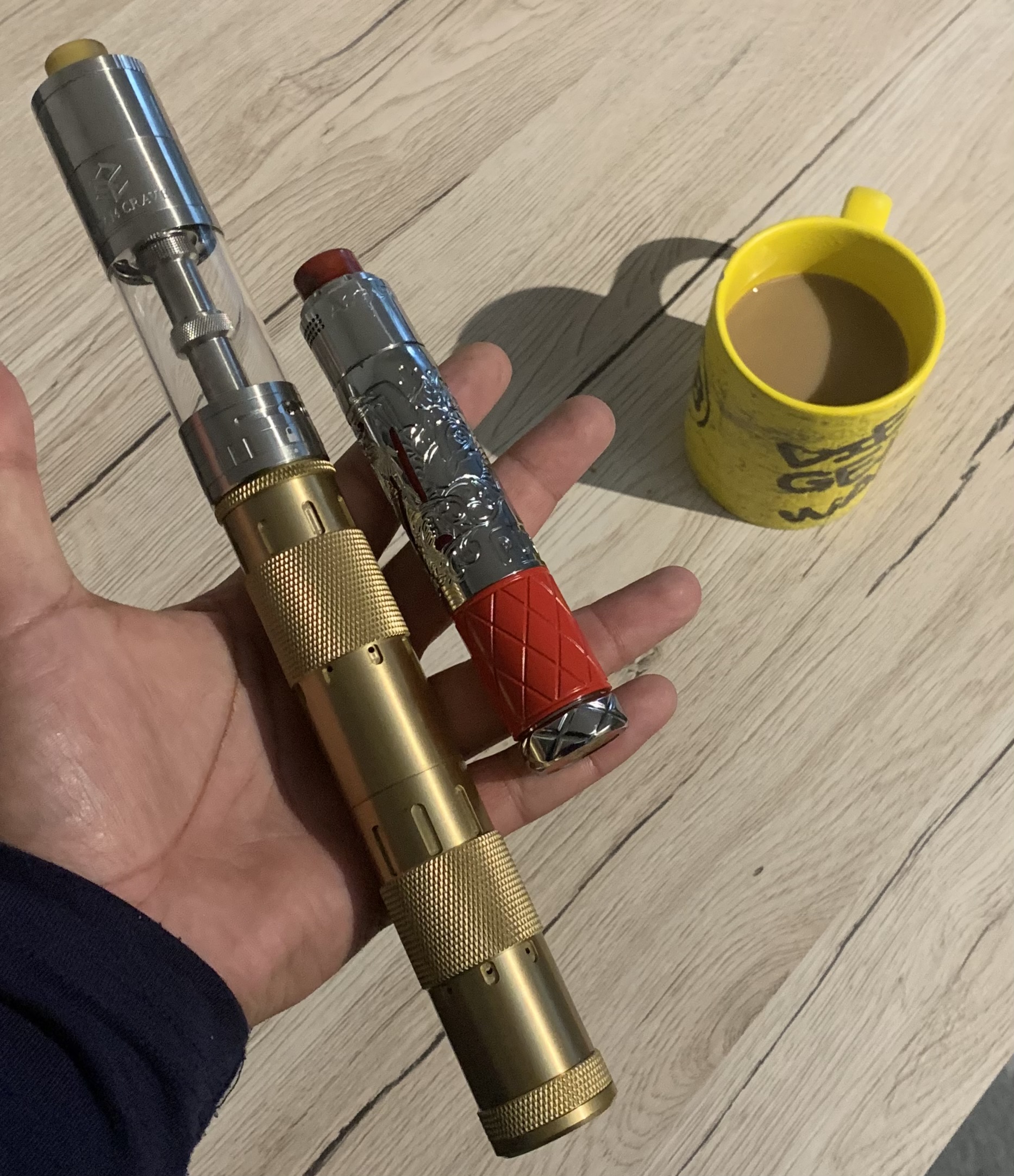 Eimer Plus V1 mit 20ml Tank und zwei Stahlerweiterungendes V2 mit V2 Topcap auf dem Vapeholic Ghul Stacker.
