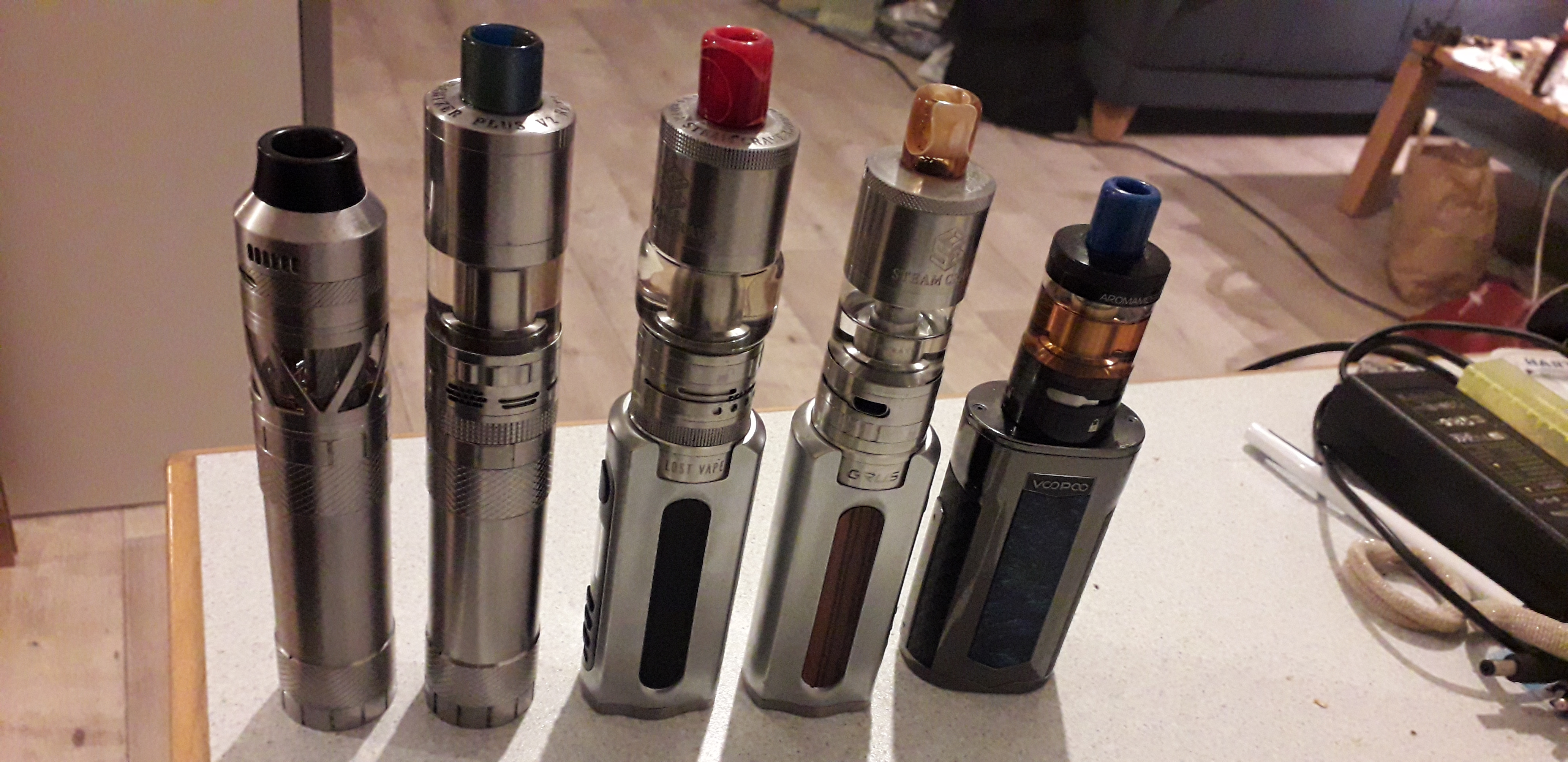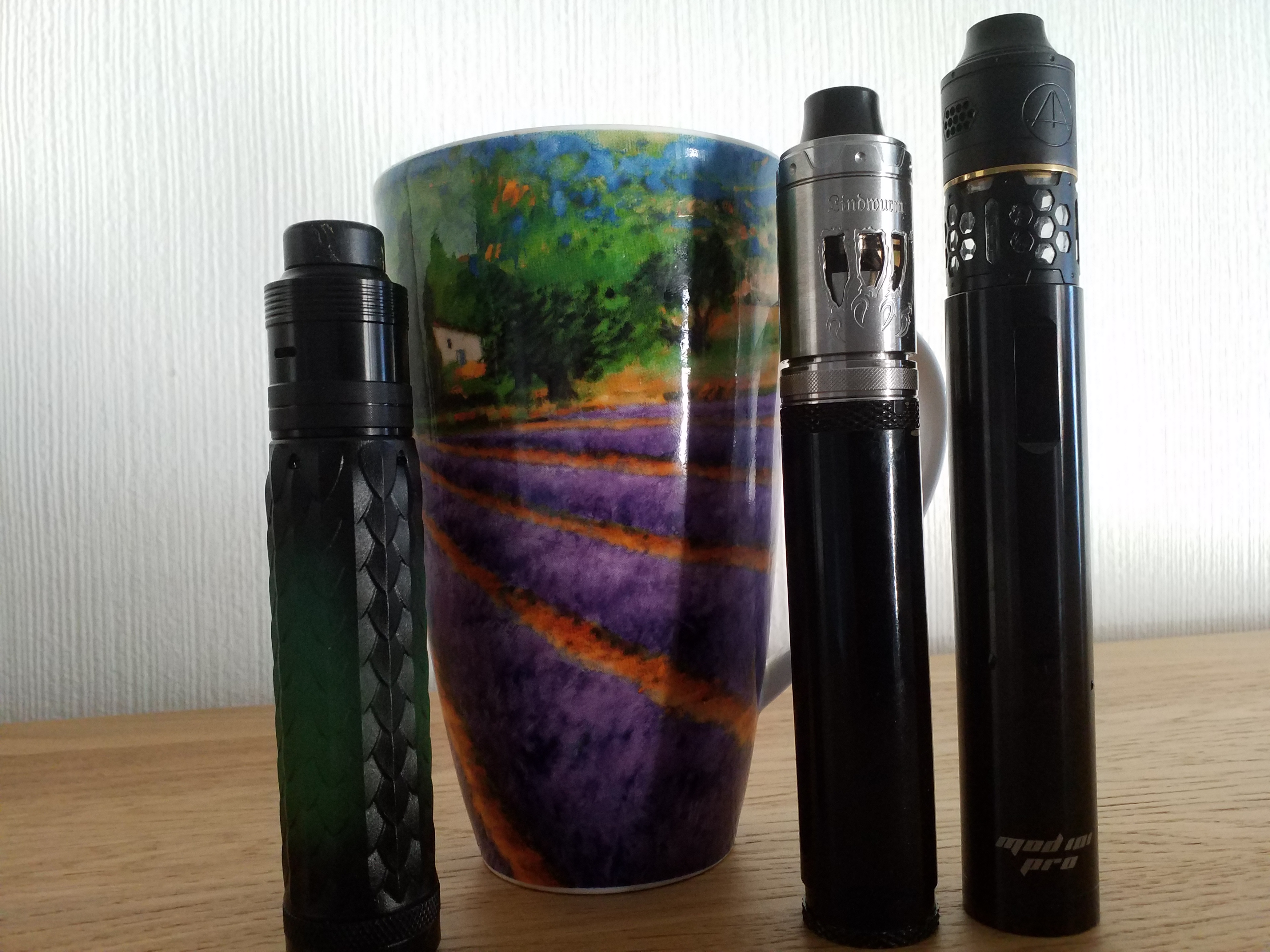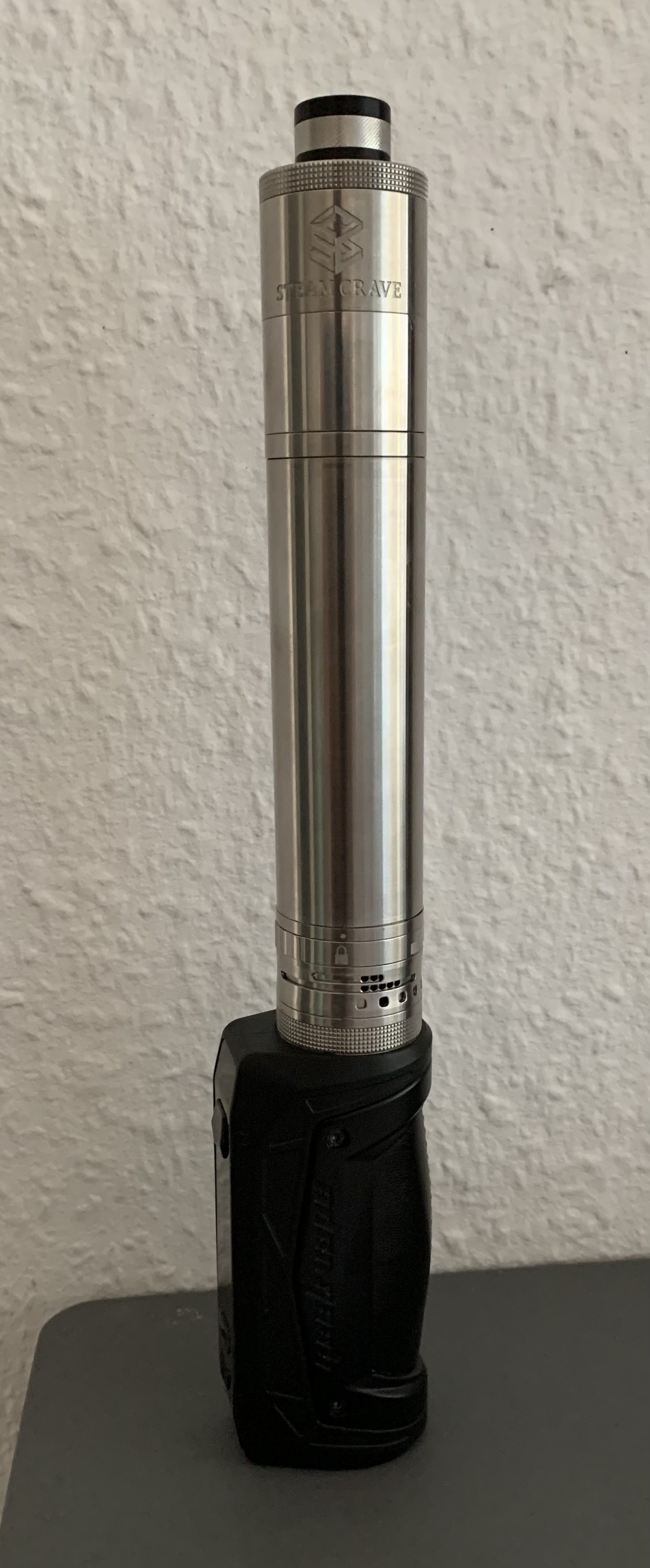Aromamizer Plus V3 mit Stahlverlängerung vom V2 und Fritschetip als Topping. Das ganze auf der Aegis Max, drinnen mit Cheshire Custard bei gemütlichen 55 Watt.