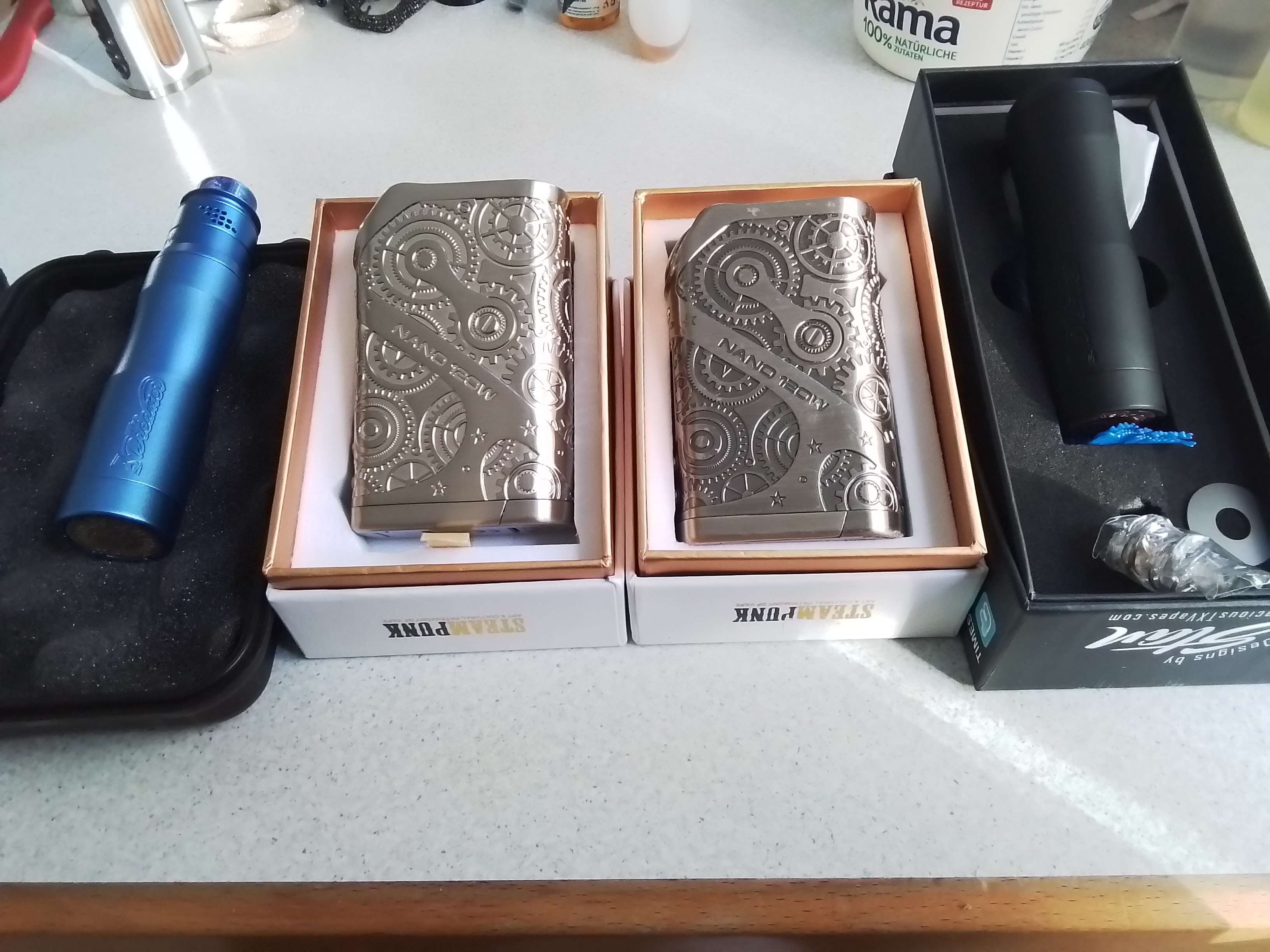 Drin waren ein nagelneuer DREAMER MECH MOD in schwarz- Ein gebrauchter DREAMER MECH MOD mit passendem RDA UND 2 Teslacigs Nano 120 - eine davon auch nagelneu.