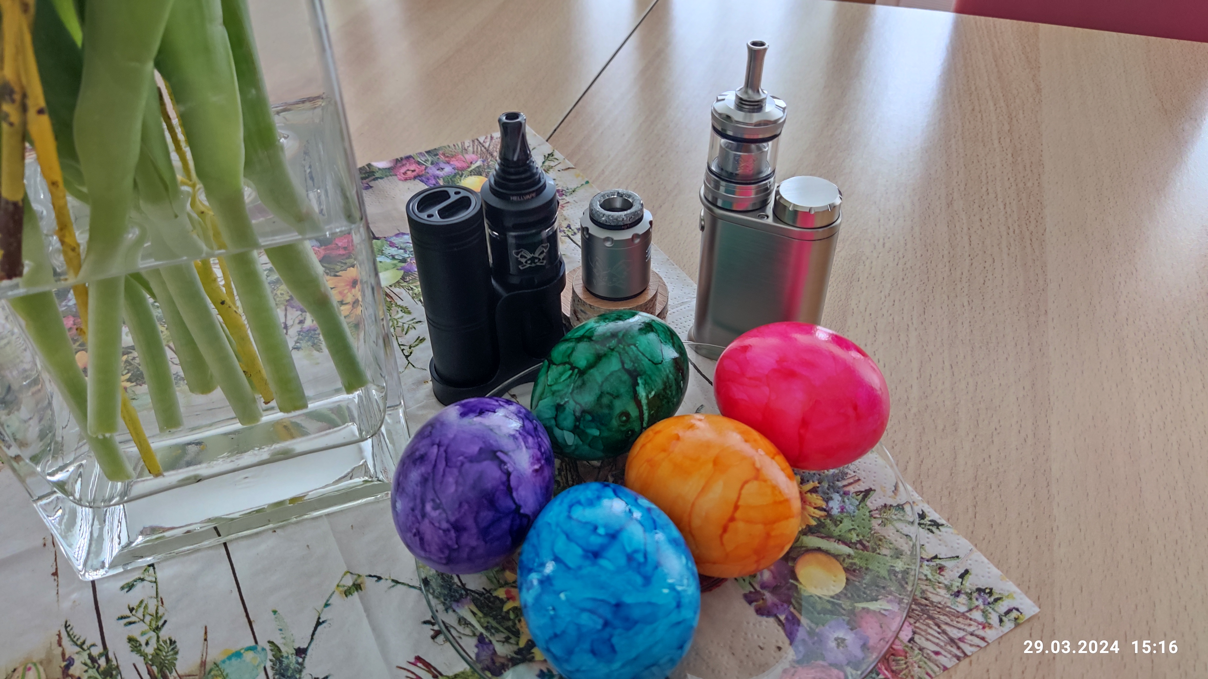 ) mit 0,26 Öhmchen und bei 54 W auf meinem vor langer Zeit geerbten Uwell Nunchaku mit lecker Freya von Lädla Juice (Kirsche, Limette & Drachenfrucht). Ups, die Ohm u.s.w. hätte ich mir ja sparen können, das Display ist ja gut zu erkennen