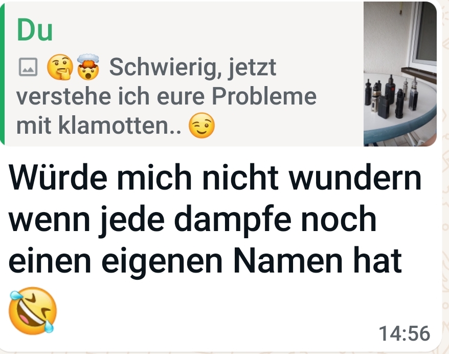 Ich stehe vor eine Dilemma und vor mir alle meine Dampfen. Wir sollen an kommende Wochenenden zum Geburtstag von die Enkelin, und das vom Freitag bis Montag. Also, erste meine längere Reise seit ich Dampfe. Ich versuche schon seit Freitag, einen Auswahl zu machen, welche soll mit. Ich verstehe langsam die Frauen und ihre Klamotten
